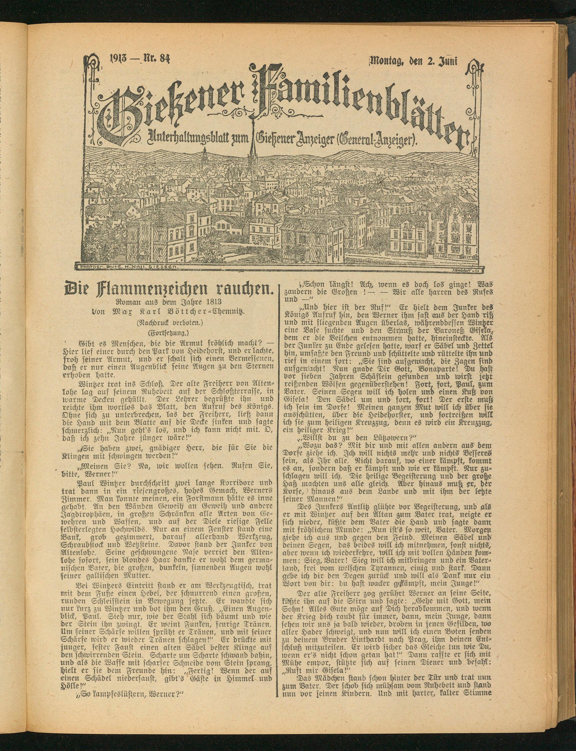 Wintzer trat ins Schloß. Der alte Freiherr von Altenlohe lag auf seinem Ruhebett auf der Schloßterrasse, in warme Decken gehüllt. Der Lehrer begrüßte ihn und reichte ihm wortlos das Blatt, den Aufruf des Königs. Ohne sich zu unterbrechen, las der Freiherr, ließ dann die Hand mit dem Matte auf die Decke sinken und sagte schmerzlich: „Nun geht's los, und ich kann nicht mit. O, daß ich zehn Jahre jünger wäre!"