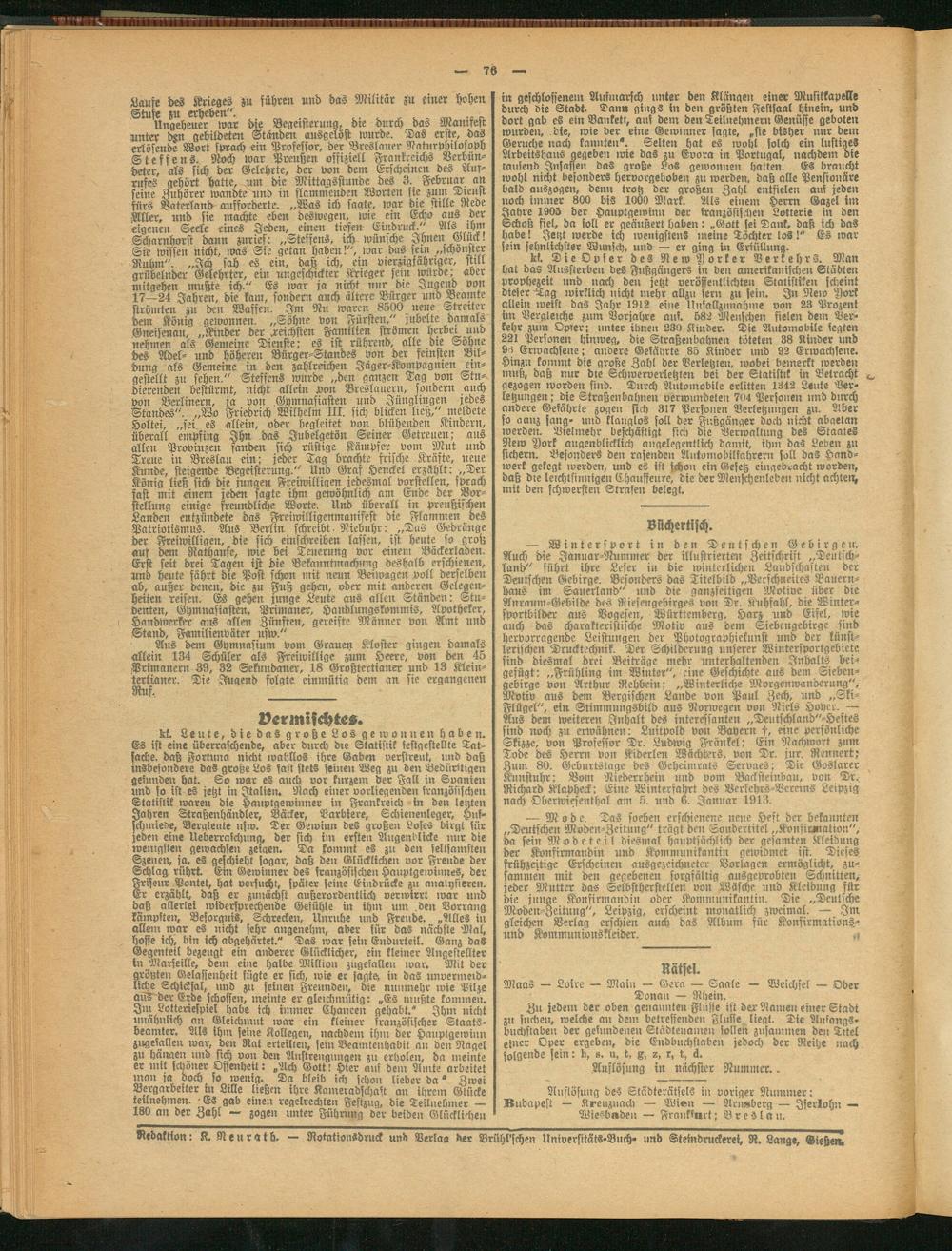 Auflösung des Städterätsels in voriger Nummer: Bubnpeft — Kreuznach — Wien — Arnsberg — Iserlohn — Wiesbaden — Frankfurt: Breslau.