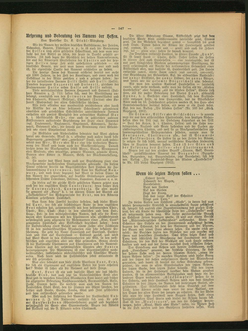 Wie ibie Namen der meisten deutschen Volksstämme, der Friesen, Schwaben, Bayern, Thüringer u. a , so ist auch die Benennung der Hessen trotz allen gelehrten Scharfsinns, mit dem man versucht hat das Rätsel zu lösen, bis heute in Dunkel gehüllt geblieben. Ist doch sogar die Gleichheit der beiden Namensformen, der aus der Römerzeit überlieferten der Chatten und der heutigen Hessen lange Zeit nicht unbestritten geblieben — ein deutlicher Beweis, wie weit man davon entfernt war und noch ist, die eigentliche Quelle des Namens erschlossen zu haben.