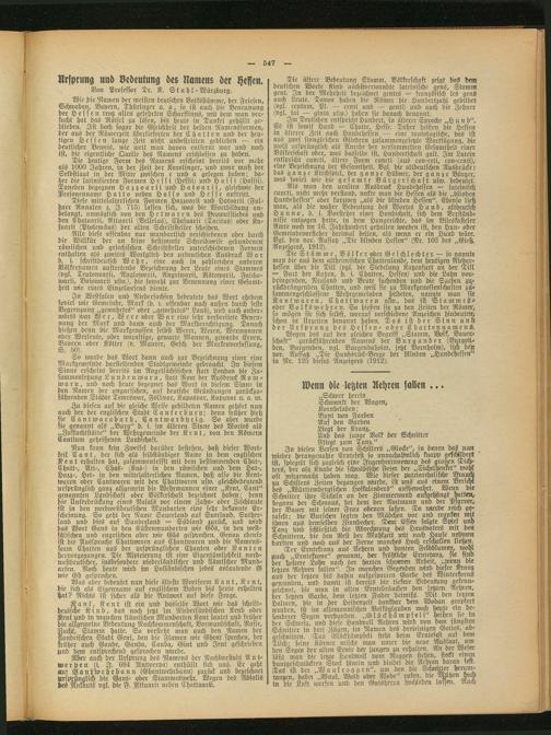 Die Stämme, Völker oder Geschlechter — so nannte man die aus dein altheimischen Chattenlande, dem heutigen Niederhessen über die Till (vgl. die Siedelung Katzenfurt an der Dill — Furt der Katzen, d. i. Chatten, Hessen) und die Lahn vor- dringenden, Neuland und Beute suchenden und die Sueben zw- rückdrängenden Chatten, und weil sie zu Markgenossenschaften zu-, sammengeschlossene Wehrgemeinden bildeten, nannte man sie Kantwaren, Chatt waren ustv., das ist Stamm es- vder V o l k s w e h r e n. So hießen sie zu den Zeiten bet Römer, so mögen sie sich selbst, worauf verschiedene Anzeichen hindeuten!,- schon in Urzeiten benannt haben. Das ist der Sinn und der Ursprung des Hessen- oder C h a t t e n n a m e n s.