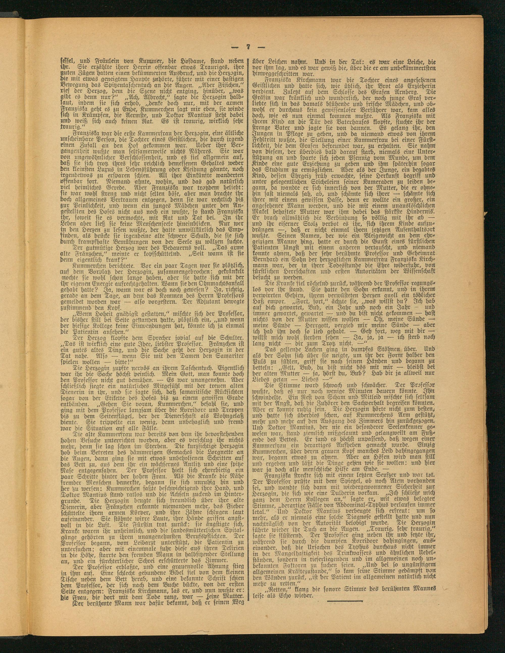 Der Professor erblaßte, und eine grauenvolle Ahnung stieg in ihm auf. Eine schlecht gebundene Bibel fiel von dem kleinen Tische neben dem Bett herab, und eine bekannte Schrift schim dem Prosessor, der sich nach deut Buche bückte, von der ersten Sette entgegen: Franziska Kirchmann, las er, unb nun wußte er: feie Frau, bie dort mit dein Tode rang, war — leine Mutter.