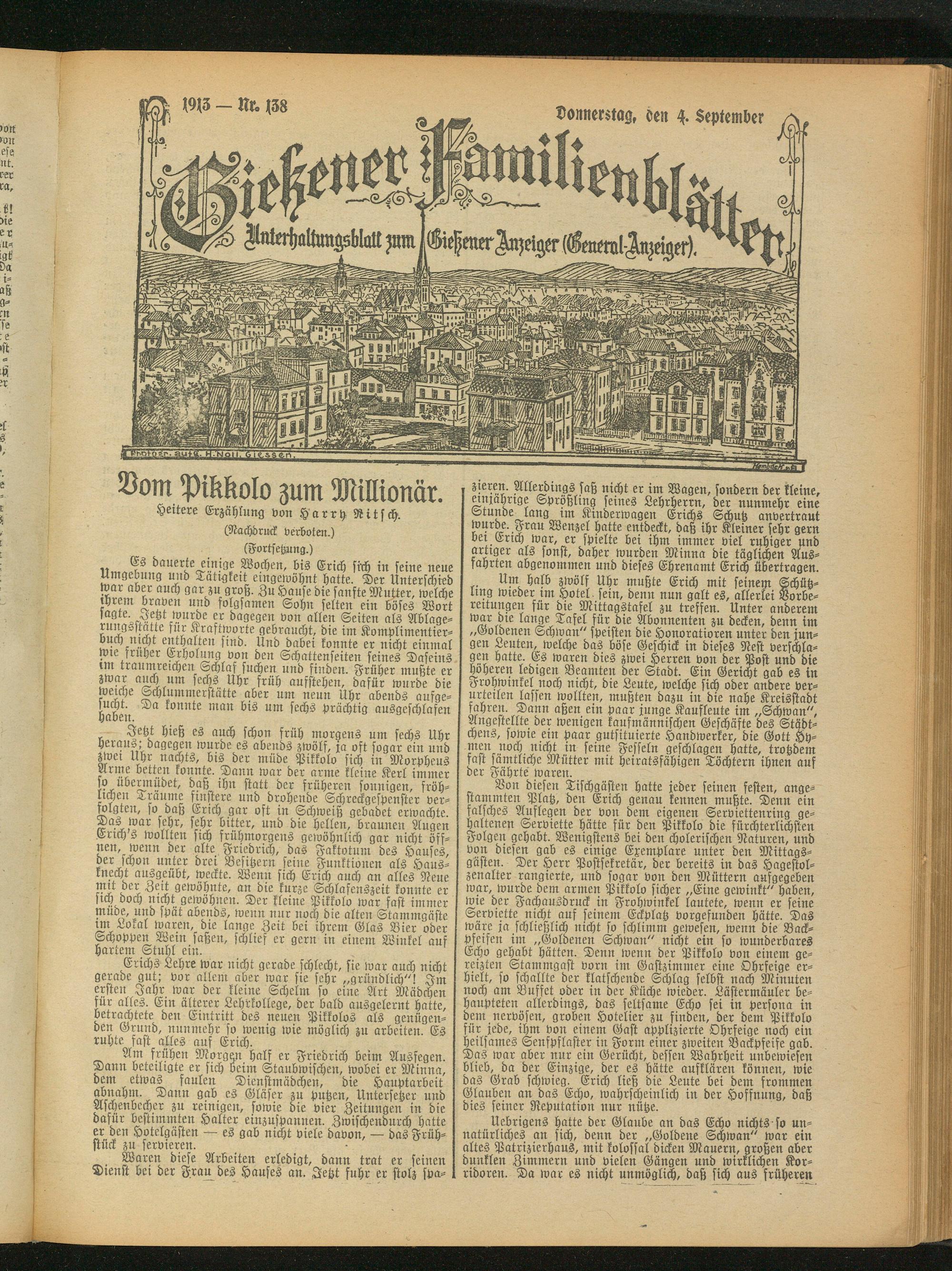 Am frühen Morgen half er Friedrich beim Ausfegen. Dann beteiligte er sich beim Staubwischen, wobei er Minna, dem etwas faulen Dienstmädchen, die Hauptarbeit ab nah m. Dann gab es Gläser zu putzen, Untersetzer und Aschenbecher zu reinigen, sowie die vier Zeitungen in die dafür bestimmten Halter einzuspannen. Zwischendurch hatte er den Hotelgästen — es gab nicht viele davon, — das Frühstück zu servieren.