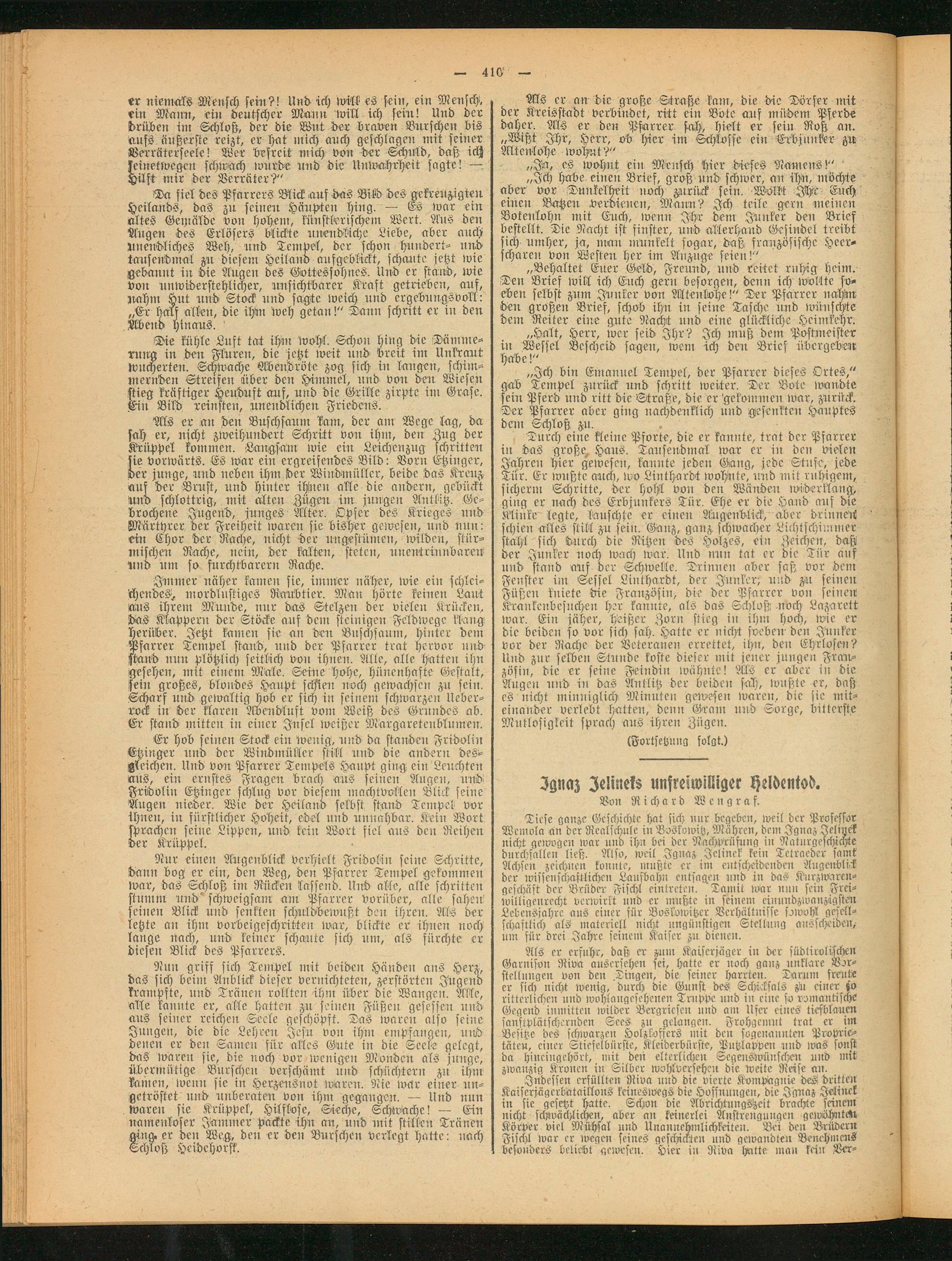 Diese ganze Geschichte hat sich nur begeben, weil der Professor Wemola an der Realschule in Boskvwitz, Mähren, dem Ignaz Jelinek nicht gewogen war und ihn bei der Nachprüfung in Naturgeschichte durchfallen ließ. Also, weil Ignaz Jelinek kein Tetraeder samt Achsen zeichnen konnte, mußte er im entscheidenden Augenblick der wissenschaftlichen Laufbahn entsagen und in das Knrzwareu- geschäst der Brüder Fischl eintreten. Damit war nun sein Frei- ivilligenrecht verwirkt und er mußte in seinem cinundzwanzigsteu Lebensjahre aus einer für Boslowitzcr Verhältnisse sowohl gesellschaftlich als materiell nicht ungünstigen Stellung ansscheiden, um für drei Jahre seinem Kaiser zu dienen.