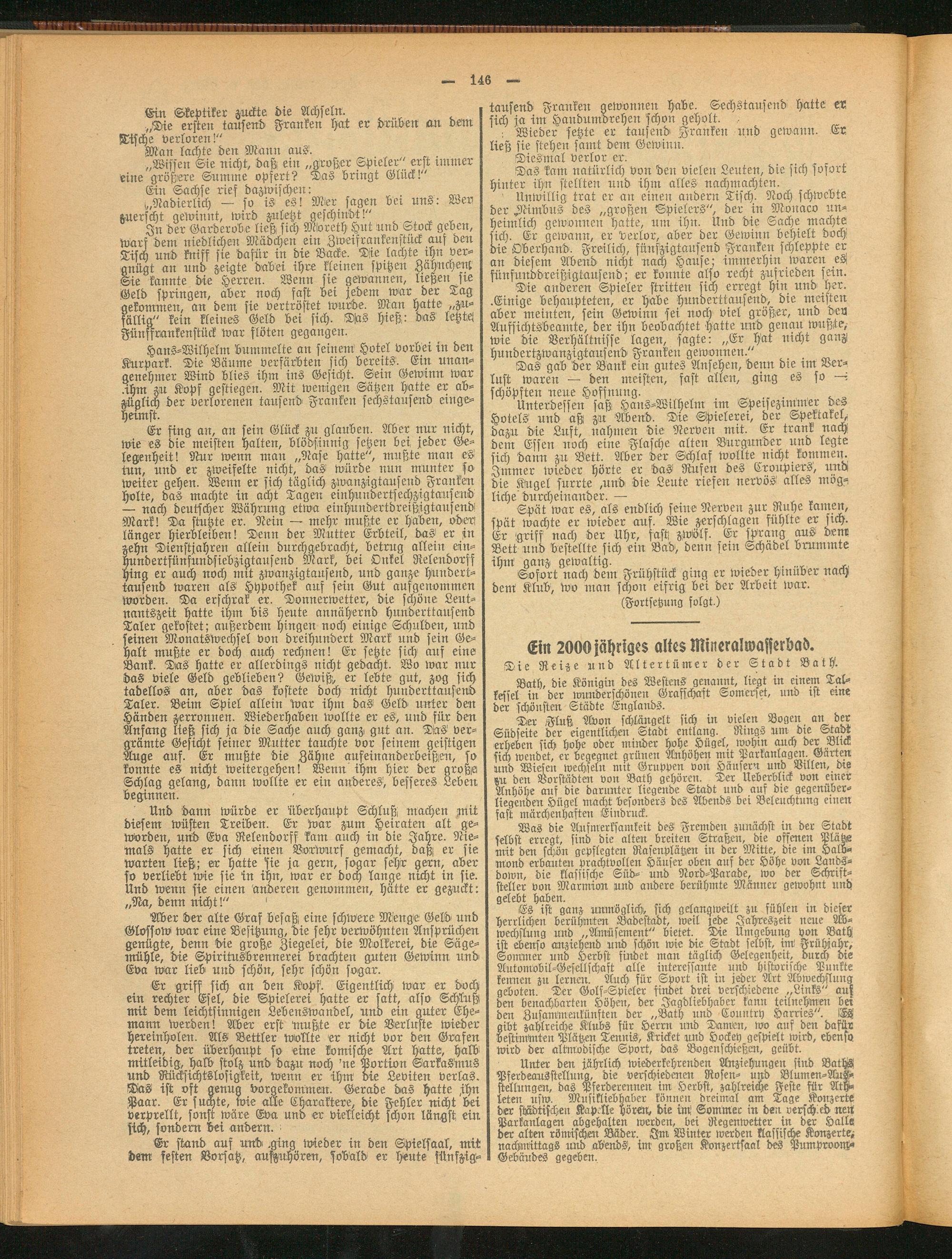 Es ist ganz unmöglich, sich gelangweilt zu fühlen in dieser herrlichen berühmten Badestadt, weil rede Jahreszeit neue Abwechslung und „Amüsement" bietet. Die Umgebung hon Bath ist ebenso anziehend und schön wie die Stadt selbst, im! Frühjahr, Sommer und Herbst findet man täglich Gelegenheit, durch dis Automobil-Gesellschaft alle interessante und historische Punkte kennen zu lernen. Auch für Sport ist in jeder Art Abwechslung geboten. Der Golf-Spieler findet drei verschiedene „Links" auf den benachbarten Höhen, der Jagdliebhaber kann teilnehmm bei den Zusammenkünften der „Bath und Country Harries". Es gibt zahlreiche Klubs für Herrn und Damm, wo auf den dafür bestimUiten Plätzen Tmnis, Kricket und Hockey gespielt wird, ebenso wird der altmodische Sport, das Bogenschießen, geübt.