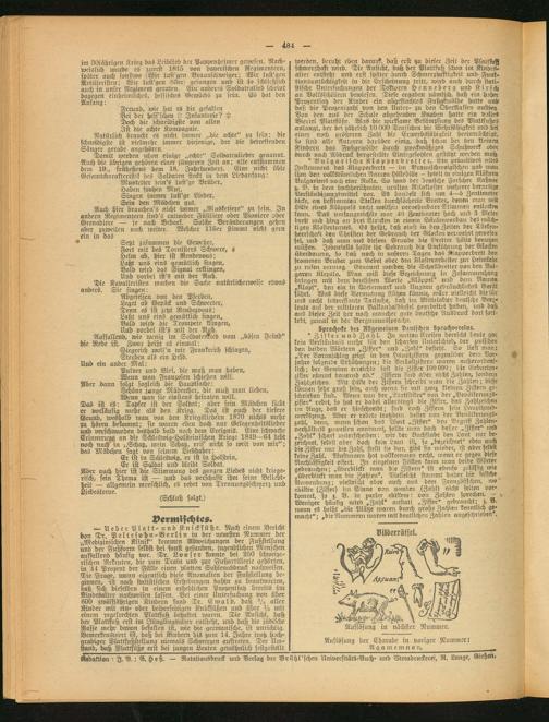 int 30jährigen Krieg das Leiblted der Pappenheimer gewesen. Nachweislich witrde es zuerst 1815 von bayerischen Regimentern, später auch sonstwo (Wir lust'gcn Braunschweiger; Wir lust'gett Artilleristen; Wir lust'gcn 83er) gesungen und ist so schließlich auch in unser Regiment geraten. Ein anderes Soldatenlied scheint dagegen einheimisches, hessisches Gewächs zu sein. Es hat den Anfang: