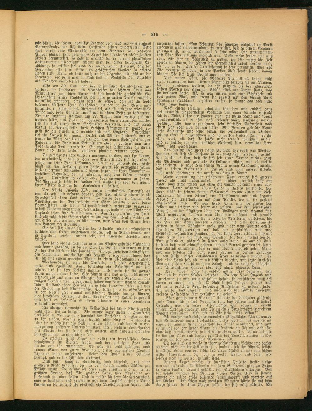 Wie billig, die schöne, grausige Legende vorn Tod des Giftmiscbers Sainte-Croix, der sich beim Herstellen seiner ^überfeinen Gifte stets durch eine Glasmaske vor dem Einatmen der tödlichen Pulver schützte, dein aber eines Tages die Maske bei dieser.heiklen Arbeit herunterfiel, so daß er alsbald tot in seinem schrecklichen Laboratorium niedersank. Bleibt man bei dieser bewährten Erzählung, so erklärt sich auch der merkwürdige Umstand, daß "ber Verbrecher alle feine Gifte und gefährlichen Papiere so achtlos liegen ließ. Kurz, ich halte mich an die Legende und nicht an die .Gelehrten, die denn auch wirklich das im Nachstehenden Erzählte als Märchen diskreditiert haben.