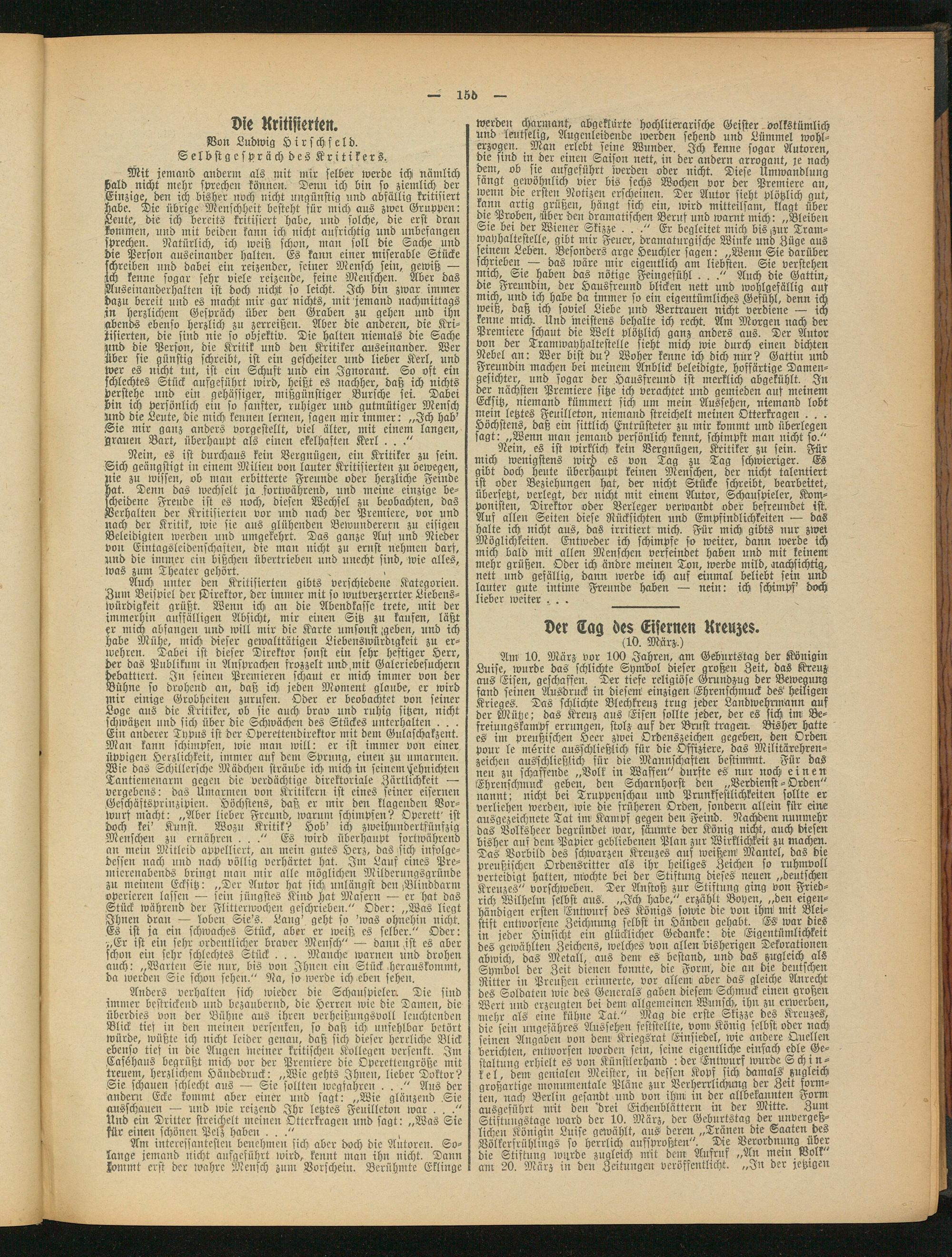 Nein, es ist wirklich fein Vergnügen, Kritiker zu sein. Für mich wenigstens wird es von Tag zu Tag schwieriger. Es gibt doch heute überhaupt keinen Menschen, der nicht talentiert ist oder Beziehungen hat, der nicht Stücke schreibt, bearbeitet, übersetzt, verlegt, der nicht mit einem Autor, Schauspieler, Komponisten, Direktor oder Verleger verwandt oder befreundet ist. Auf allen Seiten diese Rücksichten und Empfindlichkeiten — das halte ich nicht aus, das irritiert mich. Für mich gibts nur zwei Möglichkeiten. Entweder ich schimpfe so weiter, bann werbe ich mich bald mit allen Menschen verfeindet haben und mit keinem mehr grüßen. Ober ich andre meinen Ton, werde mild, nachsichtig, nett und gefällig, bann werde ich aus einmal beliebt fein und lauter gute intime Freunde haben — nein: ich schimpf’ doch lieber weiter . . .