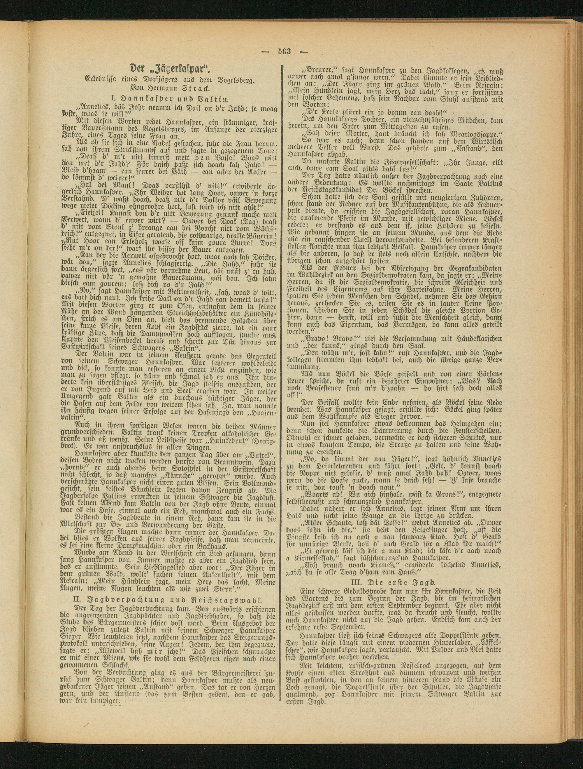 Mit leichtem, russisch-grünen Nesselrock augezogen, auf dem Kopfe einen alten Strohhnt aus dünnem schwarzen und weiße« Bast geflochten, in den an seinem Hinteren Rand die Mäuse ein Loch genagt, die Doppelflinte über der Schulter, die Jagbpfeife qualmend, zog Hannkasper mit seinem Schwager Baltin zur ersten Jagd.
