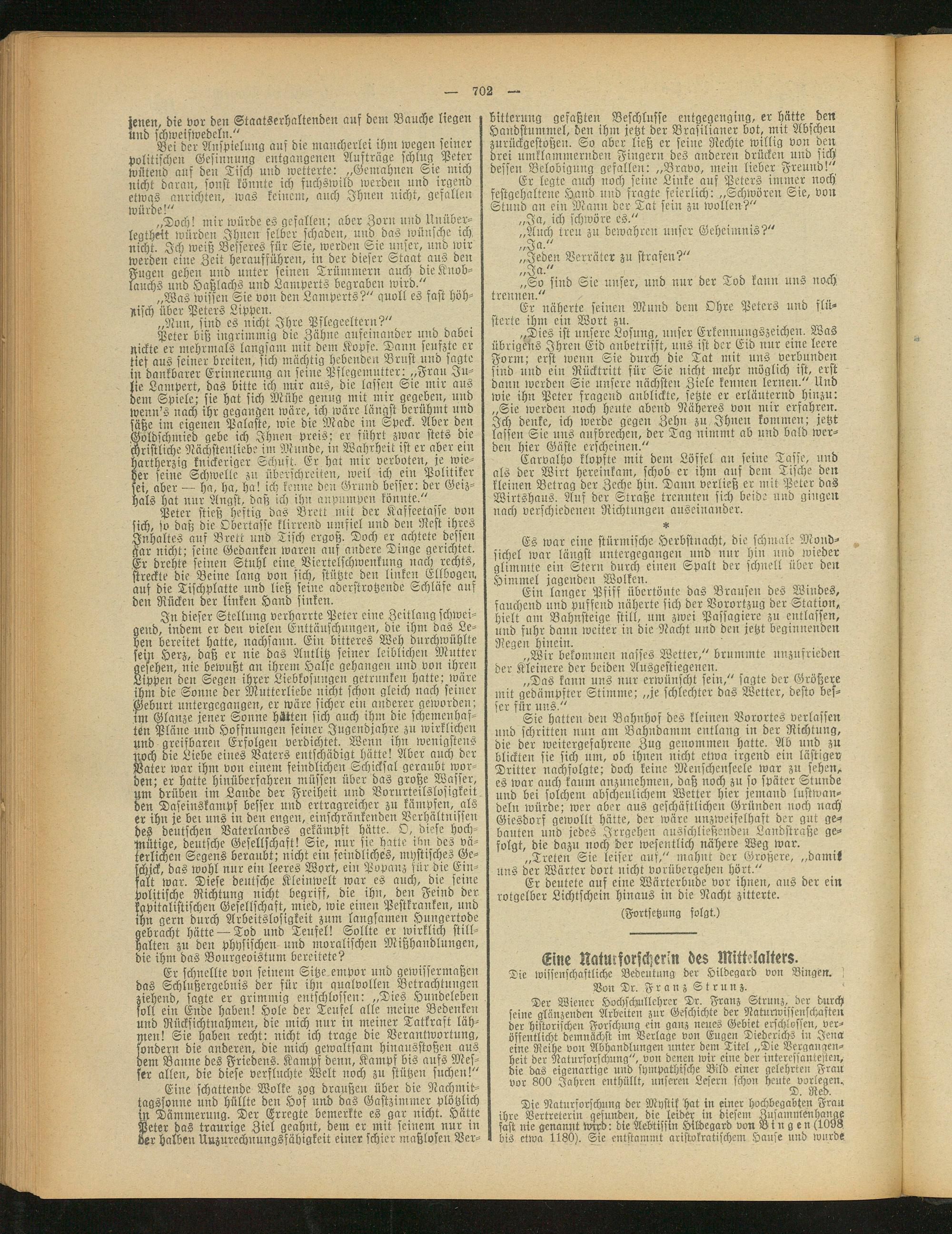 Der Wiener Hochschullehrer Dr. Frauz Strunz, der durch seine glänzenden Arbeiten zur Geschichte der Naturwissenschaften der historischen Forschung ein ganz neues Gebiet erschlossen, veröffentlicht demnächst im Berlage von Eugen Diederichs in Jena eine Reihe von Abhandlungen unter dem Titel „Die Vergangenheit der Natursorschung", von denen wir eine der interessantesten, die das eigenartige und sympathische Bild einer gelehrten Fran vor 800 Jahren enthüllt, unseren Lesern schon heute vorlegen, D. Red.