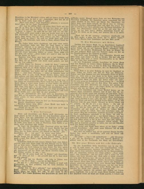 „Erscht komme die Ferrern — noach die Hoor," replizierte Hannlusper und meinte damit, daß nun nach dem Rebhuhn auch behaartes Wild an die Reihe kommen werde. Und wirklich, nach einigen Tagen brachte er einen Hasen zu Fall. Nachdem er seinen Fehler elnge;ehen, den Hasen erst ein Stück ilachzulausen, um khuen nach seiner Meinung — näher zu kommen, dann zu schießen, blieb er jetzt, durch Baltin belehrt, stehen, wenn ein Ha>e hufglng, und schoß nach ihm. So gelang es ihm denn endlich, eines Tages einen Hasen zu erlegen.