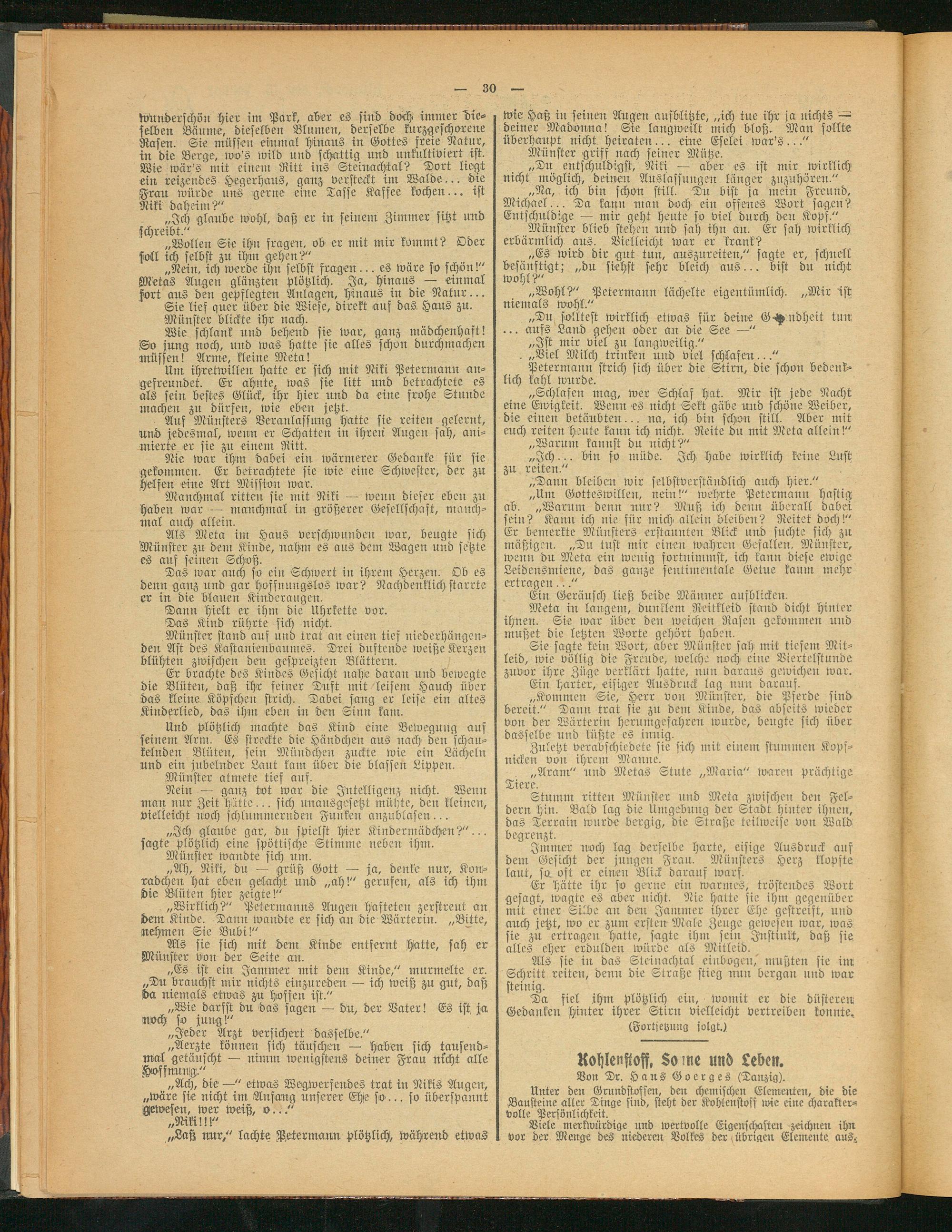 Da fiel ihm plötzlich ein, womit er die düsteren Gedanken hinter ihrer Stirn vielleicht vertreiben konnte, (Fortsetzung folgt.)