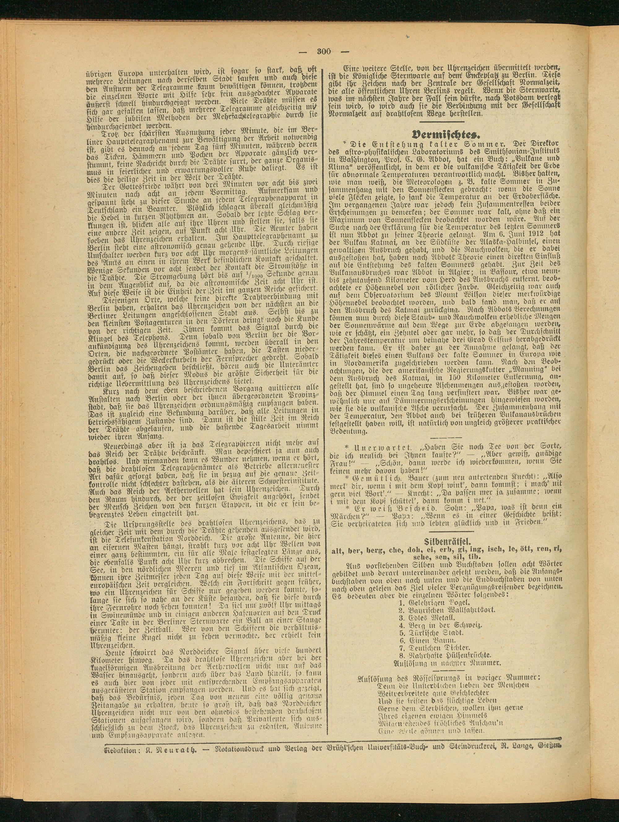 "Die Eiitstehnng kalter Sommer. Der Direktor des astro-physikalischen Laboratorimns des Smithsonian-Jnstituls in Washington, Prof. C. G. Abbot, hat ein Buch: „Vulkane und Klima" veröffentlicht, in dem er die vulkanische Tätigkeit der Erde für abnormale Temperaturen verantwortlich macht. Bisher hatten, wie man weiß, die Meteorologen z. B. kalte Sommer in Zusammenhang mit den Sonuenslecken gebracht: wenn die Sonne viele Flecken zeigte, so sank die Temperatur an der Erdoberfläche. Im vergangenen Jahre war jedoch kein Zusammentreffen beider Erscheinungen zu bemerken; der Sommer war kalt, ohne daß ein Maximum von Sonnenflecken beobachtet worden wäre. ^Auf der Suche nach der Erklärung für die Temperatur des letzten Sommers ist nun Abbot zu seiner Theorie gelangt. Am 6. Juni 1912 hat der Vulkan Katmai, an der Südküsie der Alaska-Halbinsel, einen gewaltigen Ausbruch gehabt, und die Rauchwolken, die er dabei ausgestoßen hat, haben nach AbbotL Theorie einen direkten Einfluß auf die Entstehung de? kalten Sommers gehabt. Zur Zeit des Vuikanailsbruches war Abbot in Algier; in Bassour, etwa nenn« bis zehntausend Kilometer vom Herd des Ausbruchs entfernt, beobachtete er Höhennebel von rötlicher Farbe. Gleichzeitig war auch auf dem Observatorium des Mount Wilson dieser merkwürdige Höhennebel beobachtet worben, und bald sand man, daß er auf den Ausbruch des Katmai zurückging. Stach Avbots Berechnungen können nun durch diese Staub- und Rauchwolken erhebliche Mengen der Sonnenwärme auf dem Wege zur Erde abgeiangen werden, wie er schätzt, ein Zehntel oder gar mehr, so daß der Durchschnitt der Jahrestemperatur um beinahe drei Grad Celsius herabgedrückt werden kann. Er ist daher zu der 'Annahme gelängt, daß der Tätigkeit dieses einen Vulkans der kalte Sommer in Europa wie in Nordamerika zugeschriebeu werden kann. Nach den Beobachtungen, die der amerikanische Regierungskutter „Männing" bei dem Ausbruch des Katmai, in 150 Kilometer Entkernung, an- gestellt hat, sind so ungeheure Aschemnengen auSgeitoßen ivorden, daß der Himmel einen Tag laug versinsterl war. Bisher war ge- ivchnlich nur auf Dämmerlmgserscheinungen hingewiesen worden, wie sie die vulkanische Asche verursacht. Der Zusammenhang mit der Temperatur, den Abbot auch bei früheren Vulkanausbrüchen festgestellt haben will, ist natürlich von ungleich größerer praktischer Bedeutung.