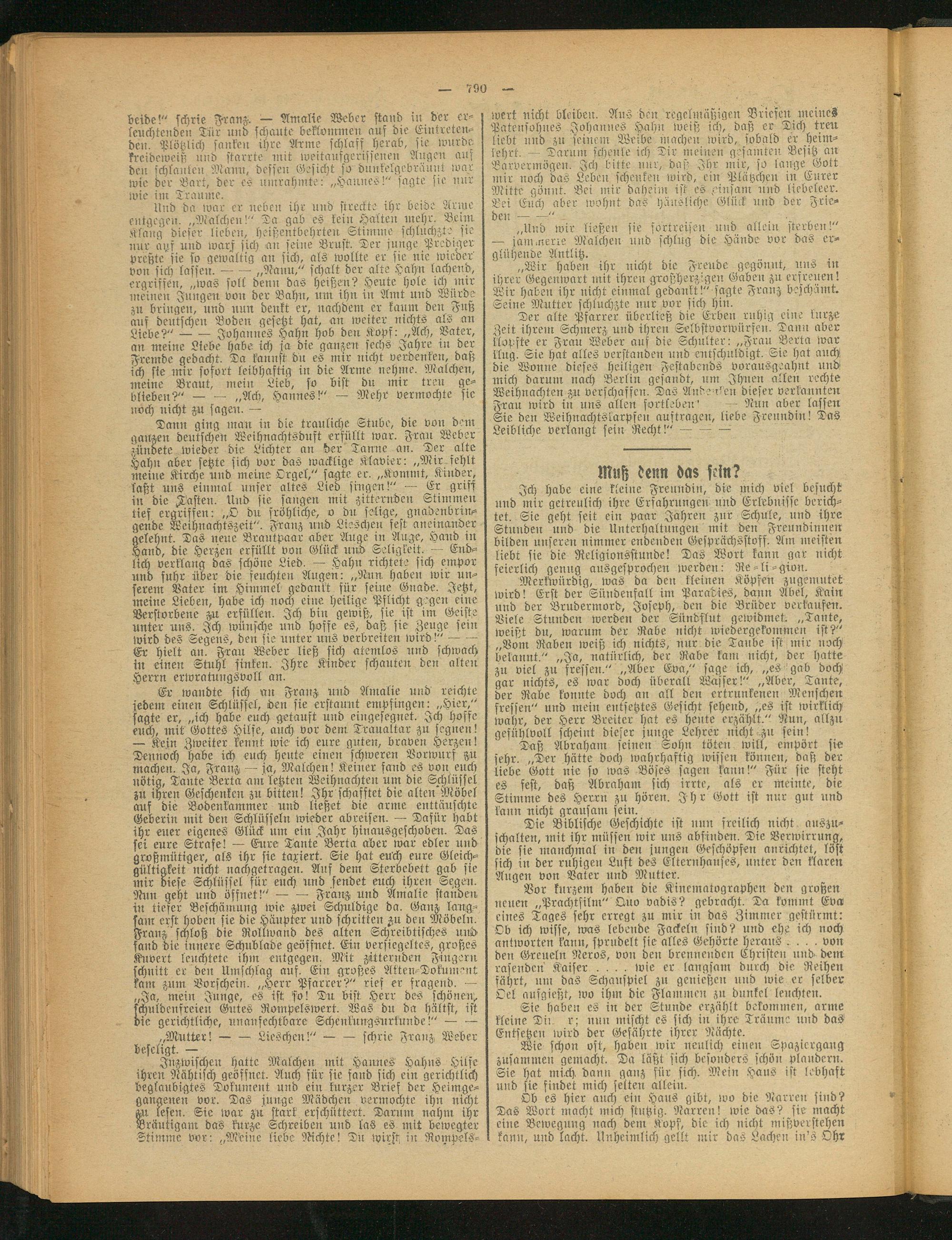 Ich habe eine kleine Freundin, die mich viel besucht und mir getreulich ihre Erfahrungen Und Erlebiiisse berichtet. Sie geht seit ein paar Jahren zur Schule, und ihre Stunden und die Unterhaltungen mit den Freundinnen bilden unseren nimmer endenden Gesprächsstoff. Am meisten liebt sie die Religionsstunde! Das Wort kann gar nicht feierlich genug ausgesprochen werden: Re-li-gion.