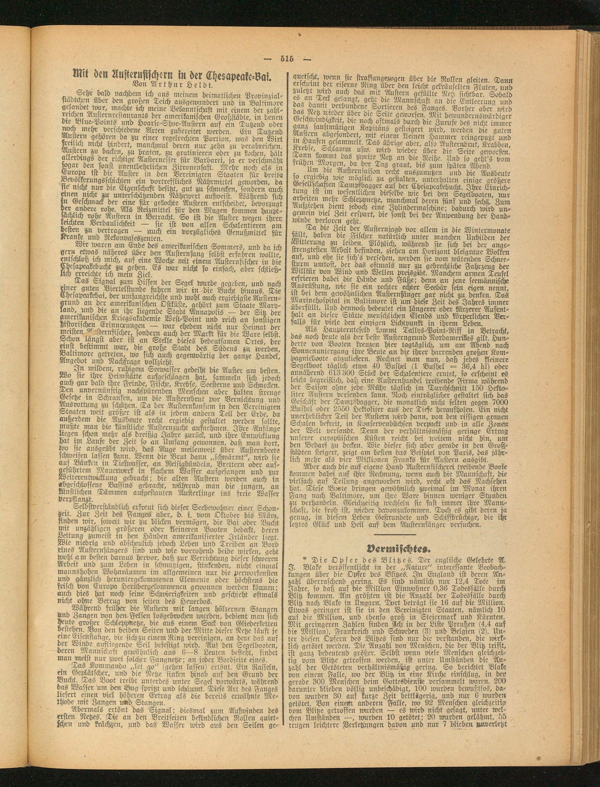 Selbstverständlich erfreut sich dieser Seebetvohner einer Schonzeit. Zur Zeit des Fanges aber, d. i. vom Oktober bis März, ftuden wir, soweit wir tzu blicken Vermögen, die Bai ober Bucht Mit unzähligen größeren oder kleineren Booten bedeckt, deren Leitung Mmeist in den Händen amerikanisierter Irländer liegt. Wie niedrig und abscheulich jedoch Leben Und Treib«! an Bord seines Austernfangers sind und wie vvrrvhend beide wirken, geht wohl am ^besten daraus Hervor, daß zur Verrichtung dieser schweren Arbeit und Mm Leben in schmutzigen, stinkenden, nicht einmal mannshohen Wohnränmen im allgemeinen nur die verworfensten und gänzlich heruntergekommenen Elemente ober höchstens die frisch von Europa Herübergekommenen gewonnen tonten können; auch hies hat noch seine Schwierigkeiten und geschieht oftmals nicht ohne Betrug von feiten des Heuerbos.