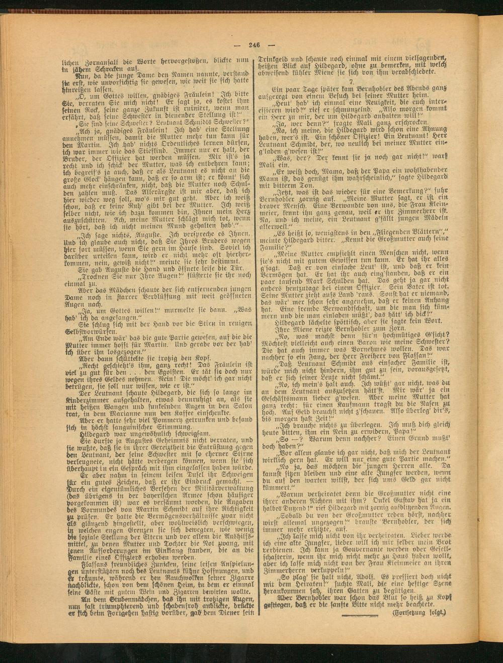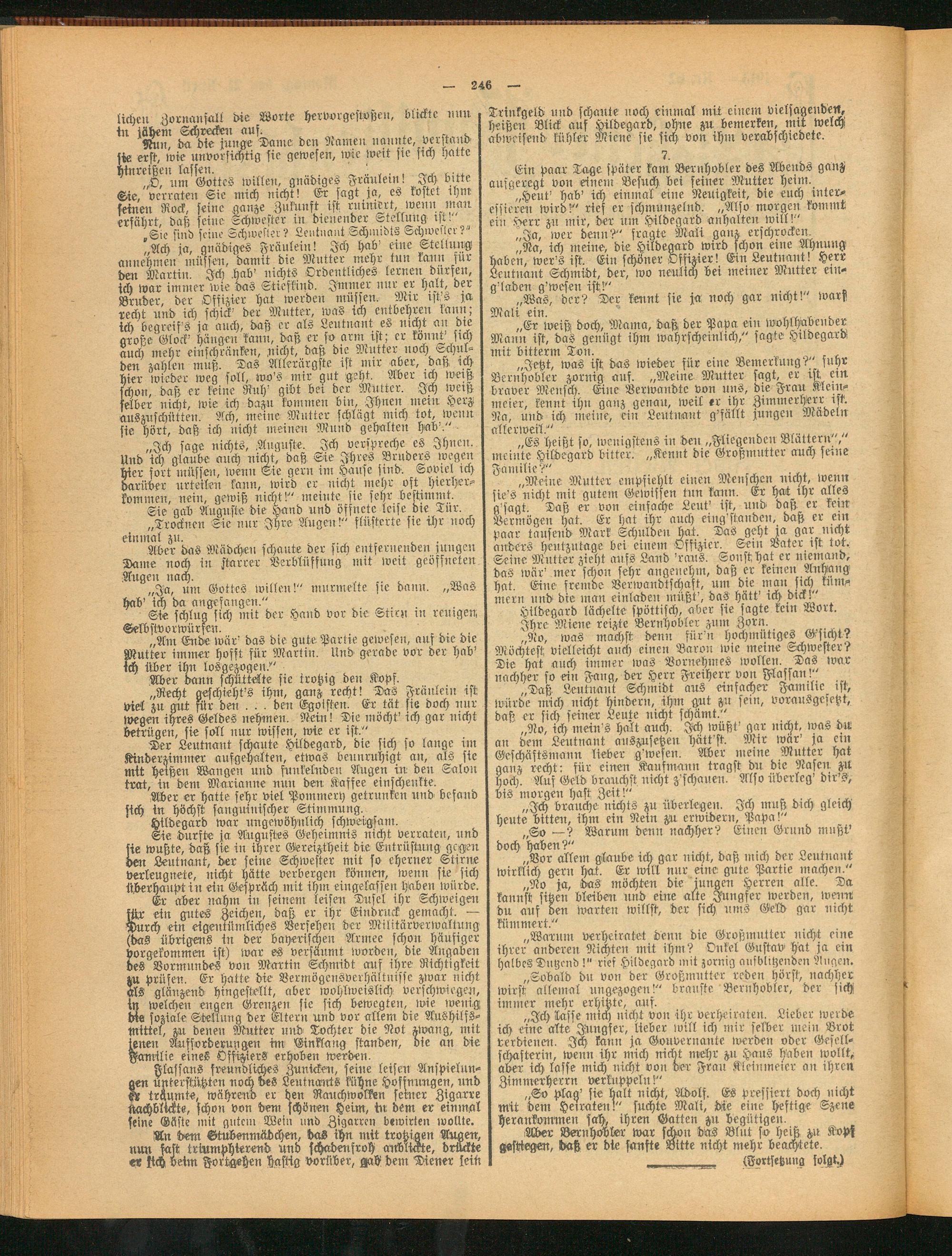 Er aber nahm in seinem leisen Dusel ihr Schweigen für ein gutes Zeichen, daß er ihr Eindruck gemacht. — Durch ein eigentümliches Versehen der Militärverwaltung (das übrigens in der bayerischen Armee schon häufiger vorgekommen ist) war es versäumt worden, die Angaben des Vormundes von Martin Schmidt auf ihre Richtigkeit zu prüfen. Er hatte die Vermögensverhältnisse zwar nicht als glänzend hingestellt, aber wohlweislich verschwiegen, in welchen engen Grenzen sie sich bewegten, wie wenig Met soziale Stellung der Eltern und vor allem die Aushilfsmittel, zu denen Mutter und Tochter die Not zwang, mit jenen Aufforderungen im Einklang standen, die an die Familie eines Offiziers erhoben werden.