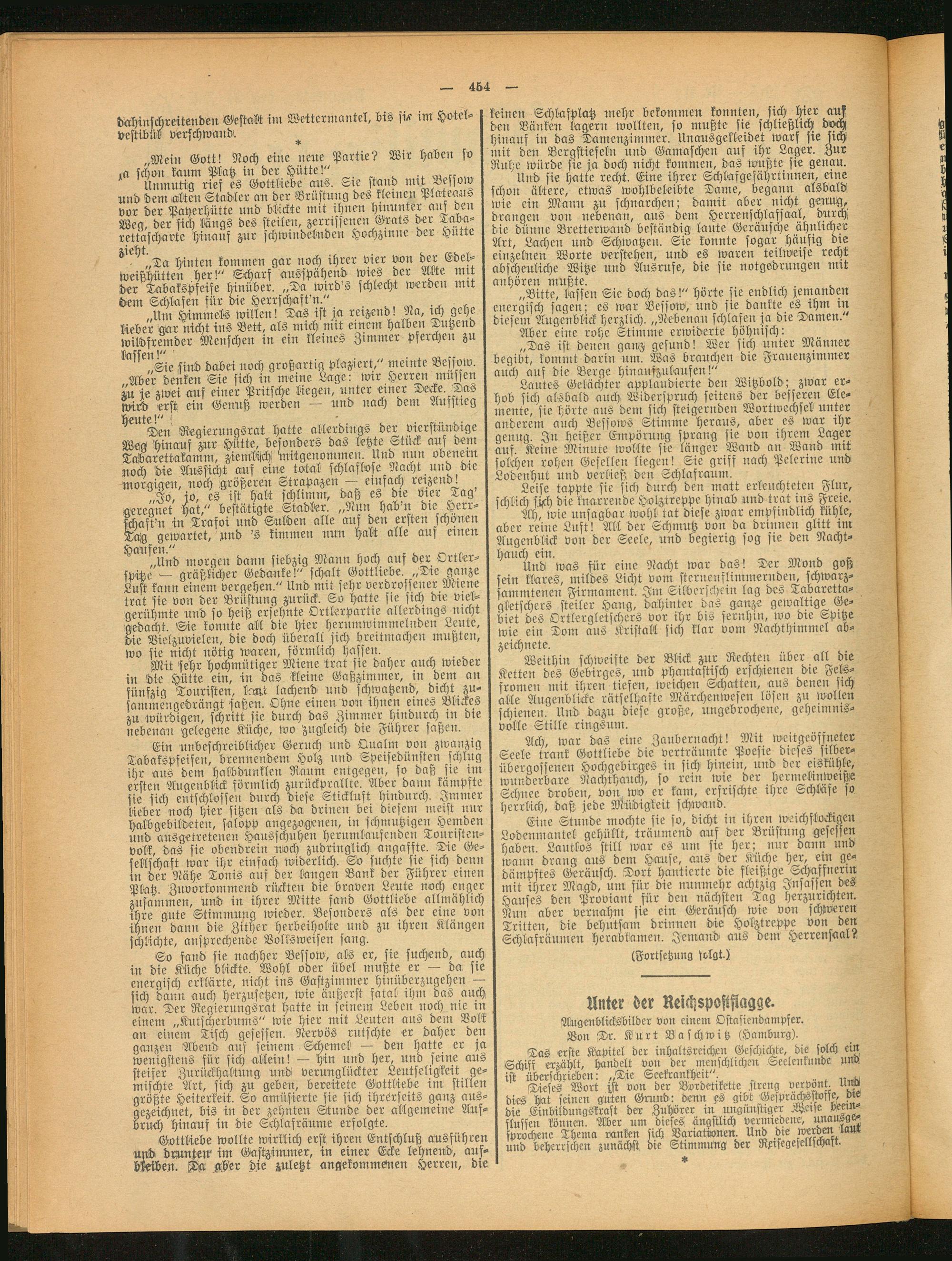 Mit sehr hochmütiger Miene trat sie daher auch wieder in die Hütte ein, in das kleine Gaßzimmer, in dem an fünfzig Touristen, laut lachend und schwatzend, dicht zu- sammengedrängt saßen. Ohne einen von ihnen eines Blickes zu würdigen, schritt sie durch das Zimmer hindurch in die nebenan gelegene Küche, wo zugleich die Führer saßen.