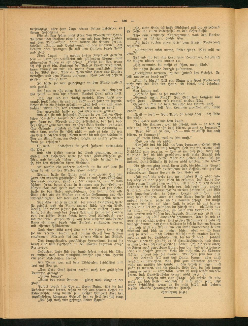 Eines Tages — sie mochte sieben Jahre alt gewesen sein — hatte Haus-Wilhelm mit glühenden Wangen und glänzenden Augen zu ihr gesagt: „Weißt du, Eva, wenn ich erst groß bin, Leutnant bei Vaters Kürassierregnnent, dann konimst du mit, als meine Frau natürlich. Denn in der Bibel steht: Aber ein Weib wird Vater und Mutter verlassen und dem Manne anhangen. 'Das hab' ich gestern gelesen. — Willst du?"