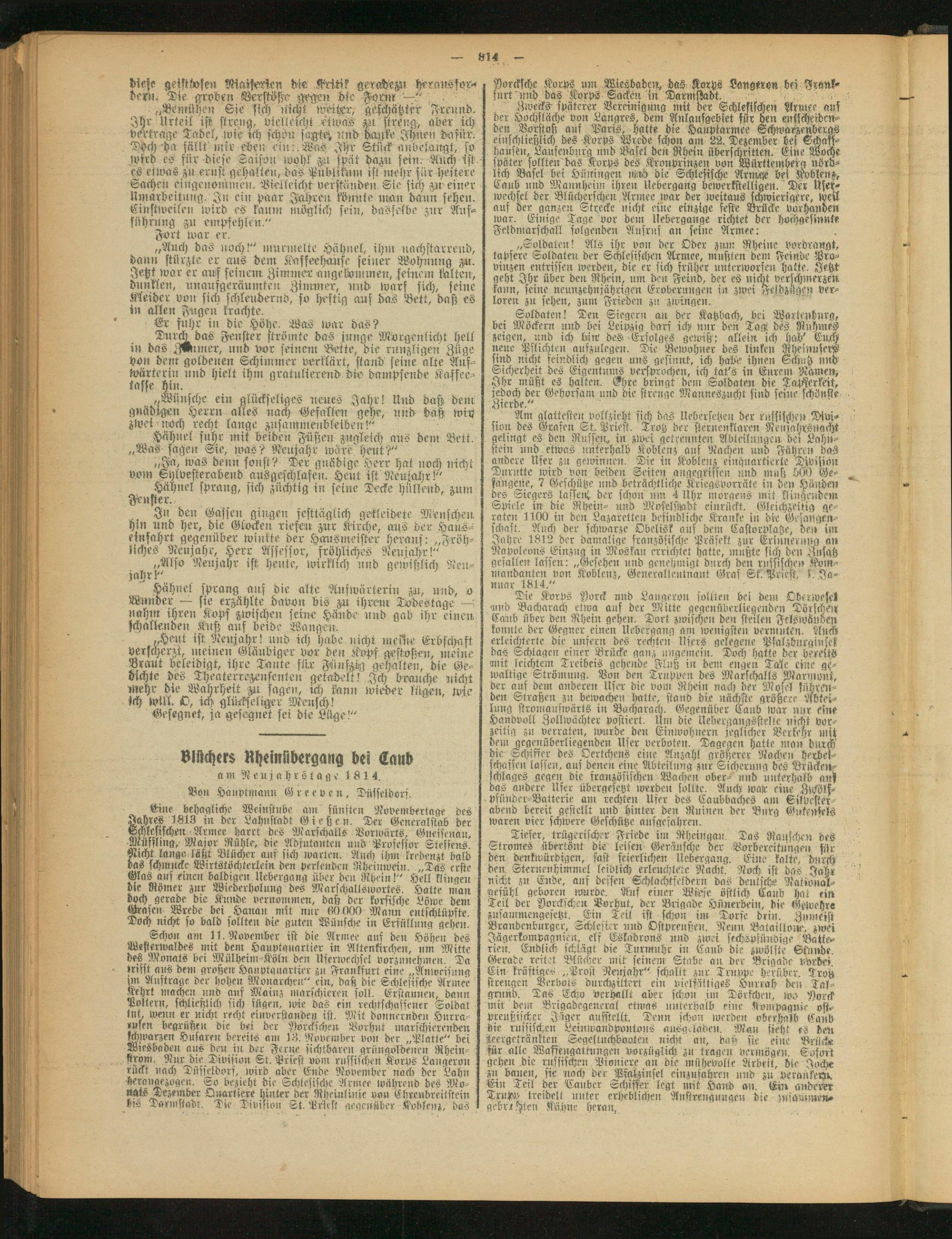 Soldaten! Den Siegern an der Kühbach, bei Wartcuburg, bei Möckern und bei Leipzig dars ich nur den Tag! des Ruhmes zeigen, und ich Irin' des Erfolges gewiß,' allein ich hab' Euch neue Pflichten aufzulegen. Die Bewohner des linken Rheinufers sind nicht feindlich gegen uns gesinnt, ich habe ihnen Schutz und Sicherheit des Eigentums versprochen, ich tat's in Eurem Namen, Ihr müßt es halten. Ehre bringt dem Soldaten die Tapferkeit, jedoch der Gehorsam und die strenge Manneszucht sind seine schönste Zierde."