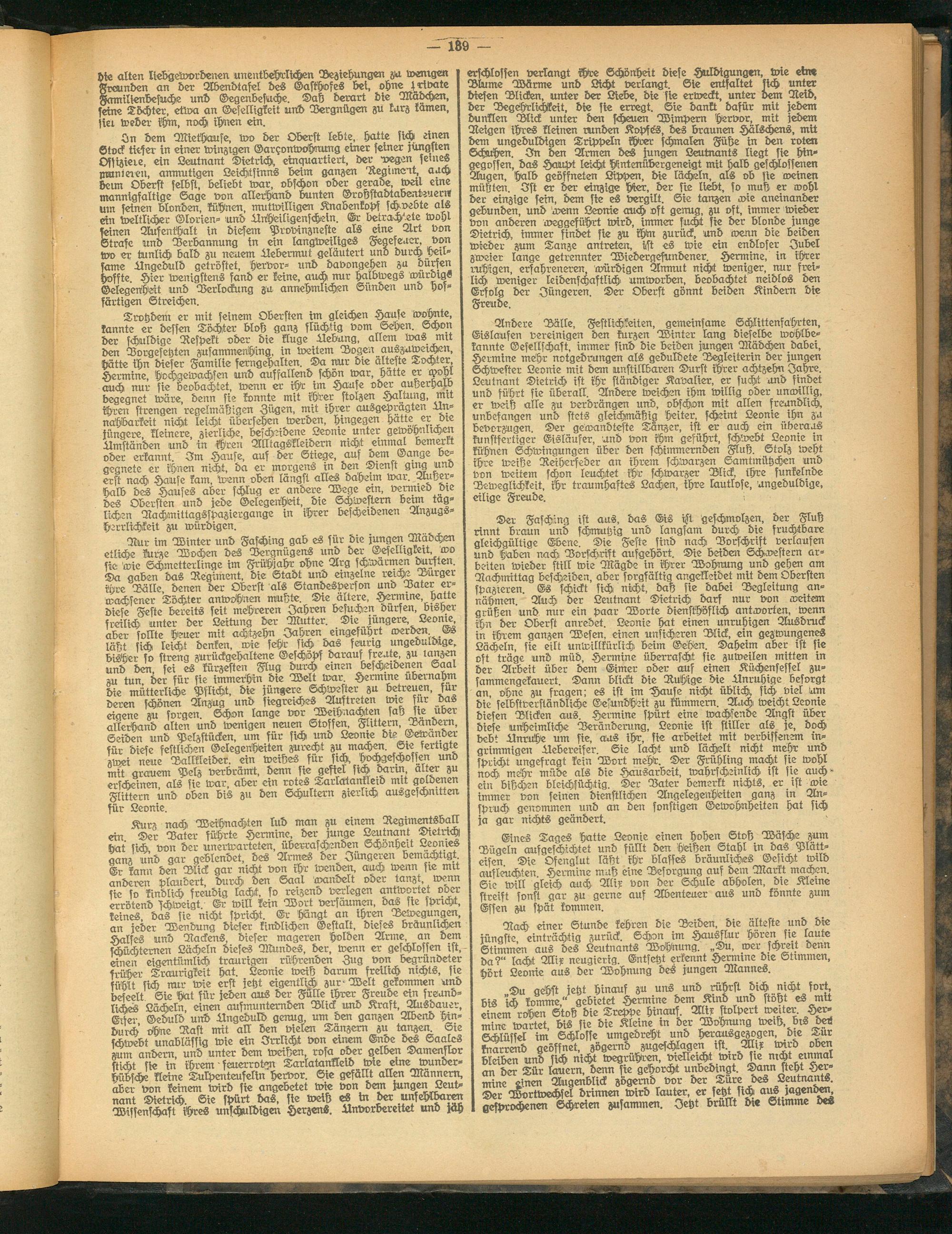 Nur im Winter und Fasching gab es für die jungen Mädchen I etliche kurze Wochen des Vergnügens und der Geselligkeit, wo I sie wie Schmetterlinge im Frühjahr ohne Arg schwärmen dursten. I Da gaben das Regiment, die Stadt und einzelne reiche Burger ihre Bälle, denen der Oberst als Standesperson und Vater erwachsener Töchter anwohnen mutzte. Die ältere, Hermine, hatte diese Feste bereits seit mehreren Jahren besuchen dürfen, bisher I freilich unter der Leitung der Mutter. Die Jüngere Leonie aber sollte Heuer mit achtzehn Jahren eingeführt werden Es läßt sich leicht denken, wie sehr sich das feurig ungeduldige, I bisher so streng zurückgehaltene Geschöpf darauf freute, zu tanzen und den, sei es kürzten Flug durch einen bescheidenen Saal M tun der für sie immerhin die Welt war. Hermme übernahm die mütterliche Pflicht, die jüngere Schwester zu betreuen, für deren schönen Anzug und siegreiches Auftreten wie für das eigene zu sorgen. Schon lange vor Weihnachten sah sie über allerhand alten und wenigen neuen Stoffen, Flickern, Bändern, ! Seiden und Pelzstücken, um für sich und Leonie die Gewänder für diese festlichen Gelegenheiten zurecht zu machen. Sie fertigte zwei neue Ballkleider, ein weitzes für sich, hochgeschossen und mit grauem Pelz verbrämt, denn sie gefiel sich Sarin, alter zu erscheinen als sie war, aber ein rotes Tarlatankleid mit goldenen Süttern und oben bis zu den Schultern zierlich ausgeschnitten für Leonie.
