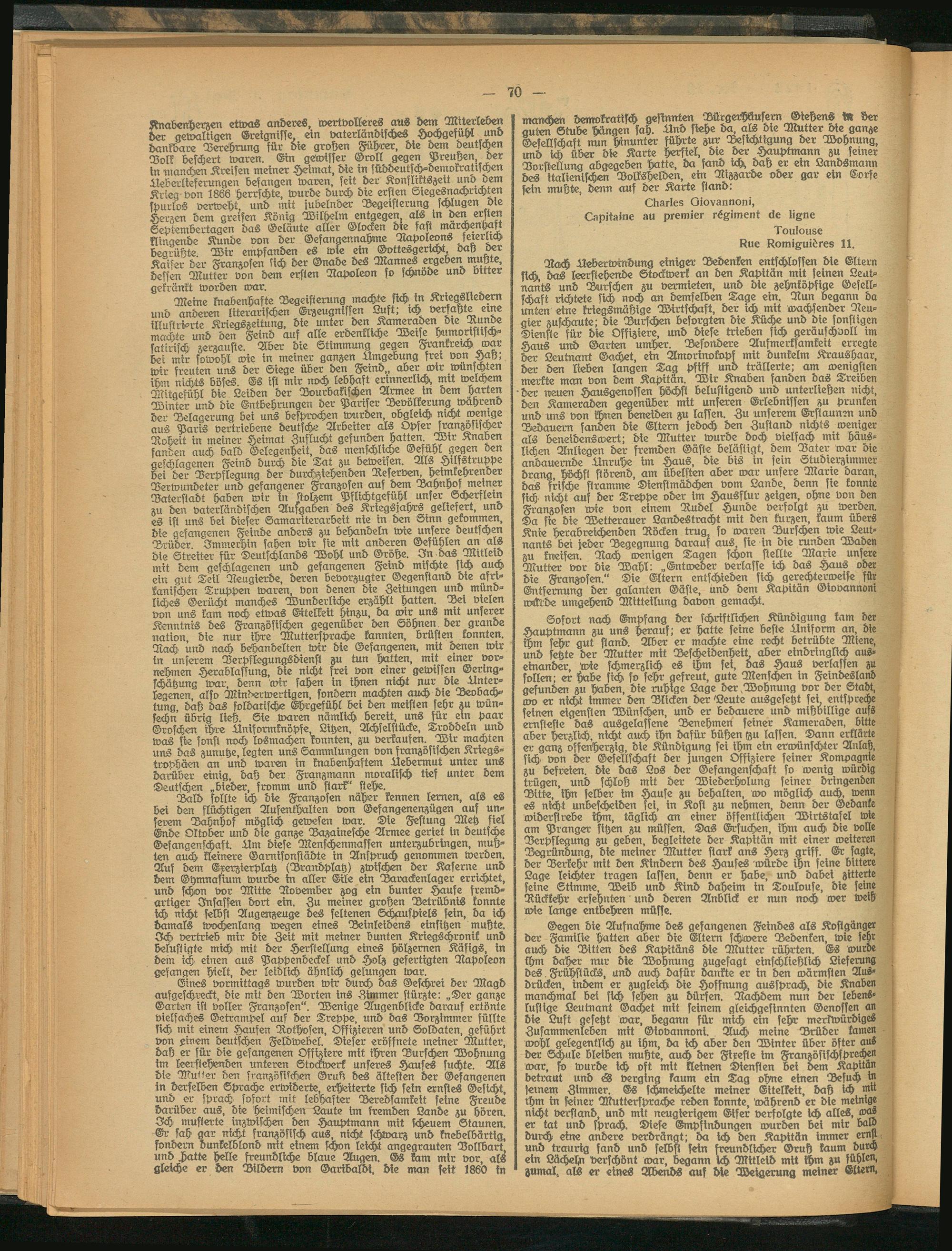 Eines vormittags wurden wir durch das Geschrei der Magd aufgeschreckt, die mit den Worten ins Zimmer stürzte: „Der ganze Garten ist voller Franzosen". Wenige Augenblicke darauf ertönte vielfaches Getrampel auf der Treppe, und bas Vorzimmer füllte sich, mit einem Haufen Rothvsen, Offizieren und Soldaten, geführt von xinem deutschen Feldwebel. Dieser eröffnete meiner Mutter, daß er für die gefangenen Offiziere mit ihren Burschen Wohnung im leerstehenden unteren Stockwerk unseres Hauses suchte. Als die Mu<<er den französischen Gruß des ältesten der Gefangenen in derselben Sprache erwiderte, erheiterte sich sein ernstes Gesicht, und er sprach sofort mit lebhafter Beredsamkeit seine Freude darüber aus, die heimischen Laute im ftemden Lande zu hören. Zch musterte inzwischen den Hauptmann mit scheuem Staunen. Er sah gar nicht französisch aus, nicht schwarz und knebelbärtig. sondern dunkelblond mit einem schon leicht angegrauten Vollbart, und chatte helle freundliche blaue Augen. Es kam mir vor, als gleiche er den Bildern von Garibaldi, die man seit 1860 in