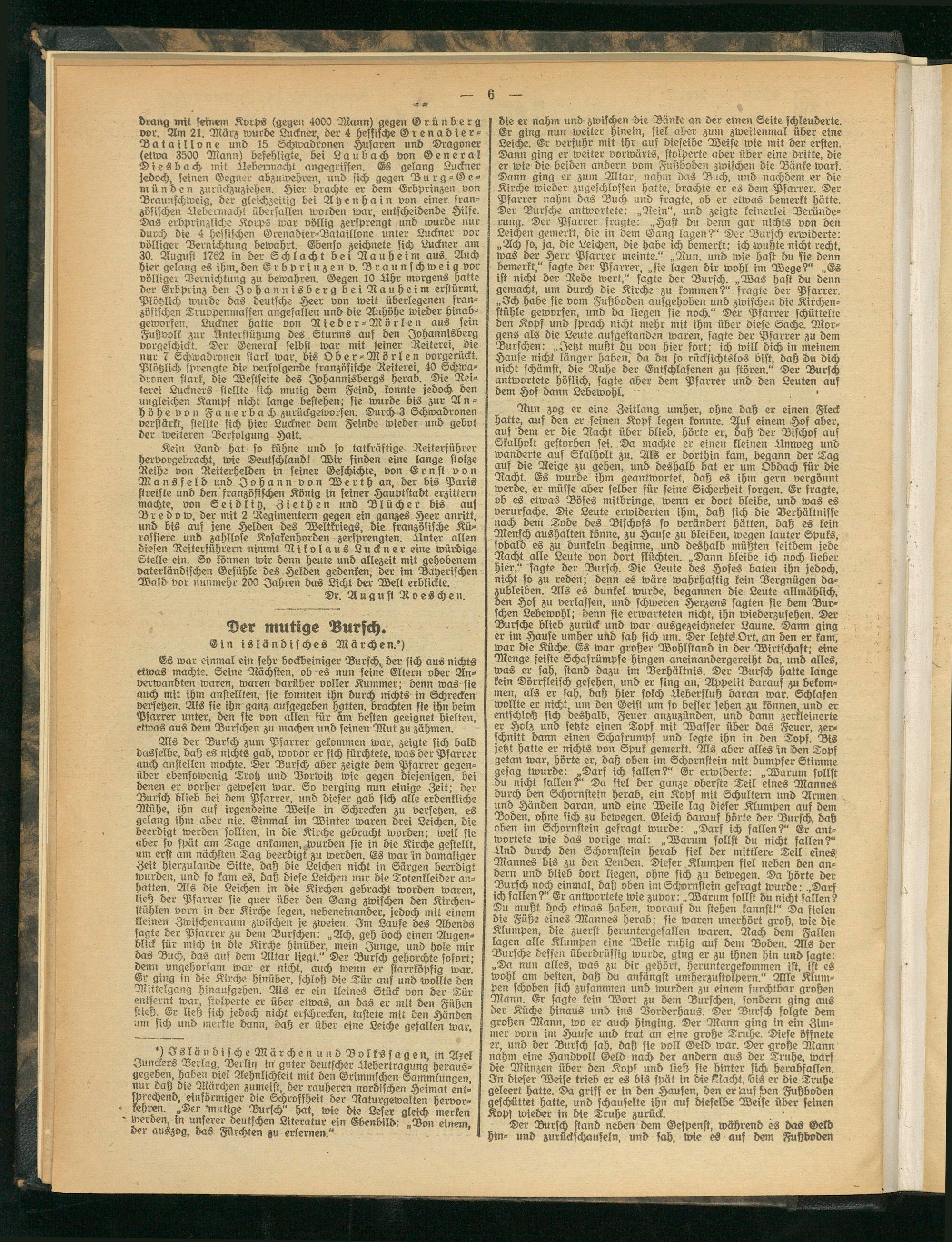 Märchen und Volkssagen, in Axel Junckers Verlag, Berlin in guter deutscher Äebertragung herausgegeben, haben viel Aehnlichkeit mit den Grimmschen Sammlungen nur dah die Märchen zumeist, der rauheren nordischen Heimat ent-’ sprechend, einförmiger die Schroffheit der Raturgewalten hervorkehren. „L>er Mutige Bursch" hat, wie die Leser gleich merken " werden, in unserer deutschen Literatur ein Ebenbild: „Von einem.