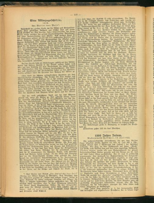 Die mohammedanische Zeitrechnung, die von dem Kalifen Omar festgesetzt wurde, beginnt mit dem 16. Juli 622 n. Ehr., welches Datum dem 1. Muharrem des Jahres 1 der HAschra entspricht. Der Tag, an dem Mohammed auf seiner „Flucht aus Mekka nach Medina kam und dort seine eigentliche Religions- gründung begann, wurde also zum Ausgangspunkt der ganzen mohammedanischen Kultur gemacht, und wir können am 16. Juli auf 1300 Jähre Islam zurückblicken. Der 16. Juli ist willkürlich angenommen. Der Zeitpunkt der Auswanderung des Religionsstifters läßt sich nicht mit Bestimmtheit angeben; er liegt zwischen dem 22. Juni und dem 20. September 622. Jedenfalls aber bedeutet die Hedschra den großen Wendepunkt im Leben Mohammeds, den älebergang dvn jener Epoche, in der er als edler Eiferer und Dulder- mckhr für seine Person die Wahrheit suchte, zu der Zeit der eigentlichen Religionsgründung, in der er als nüchterner zielbewuhter Herrscher in ewigen Kriegen die Anerkennung seiner Lehre erzwang. Mohammed hatte als schlichter Kaufmann nach seiner Erleuchtung in seiner Heimatstadt Mekka sich zunächst den „Hannrfen" angeschlossen, frommen Männern, die die Lehre der Christen oder Juden annahmen und sie in frommer Beschaulichkeit sich zu 'eigen machten. Erst allmählich Moto tn lecyzeyn or<y,rerr;cyeu otujveu g<6|unii«wu yuu i»» i trat kr aus der Zahl"fü^Vor- wirklich scharf umriffene, aber in ihder Stimmung lebensvolle,- persönliche Angelegmrhert behandelten, heraus, ^aber die Do mit flotter Hand Wngewvrfene Bilder, die den Zeitgenossen, I stellungen, die ihn beher^chten, zwangen ihn, seine Lehre auch auch wenn die Motive mitunter düster sind, erheben wrö er- seiner Umgebung zu veEndigen. .