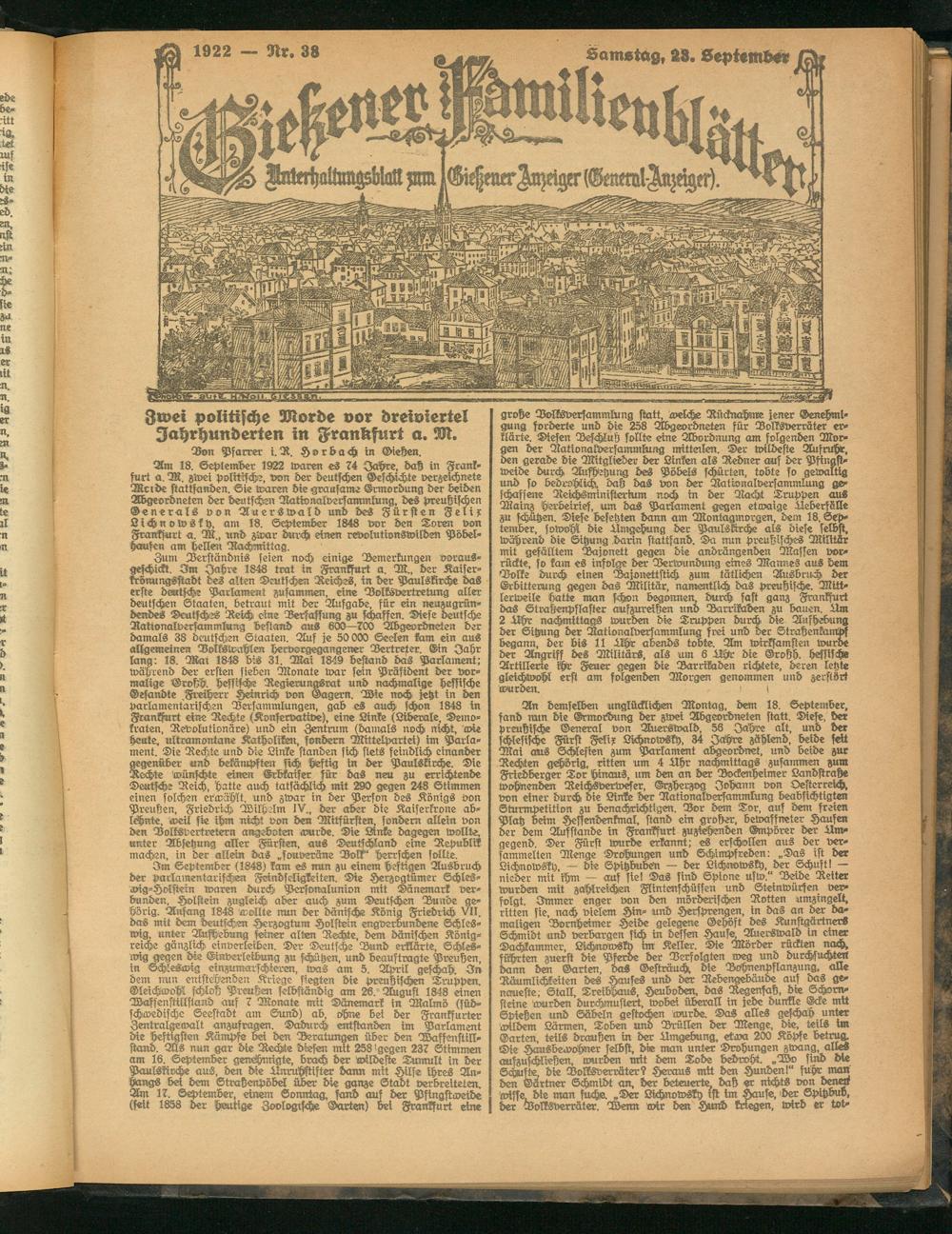 Am 18. September 1922 waren es 74 Jahre, daß in Frankfurt a. M. zwei politische, von der deutschen Geschichte verzeichnete Meide stattfanüen. Sie waren die grausame Ermordung der Leiden Abgeordneten der deutschen Rationalversammlung, des preußischen Generals von Auerswald und des Fürsten Felix Lichnowskh, am 18. September 1848 vor den Toren von Frankfurt a. M„ und zwar durch einen revolutivnswilden Pöbel- Haufen am Hellen Nachmittag.