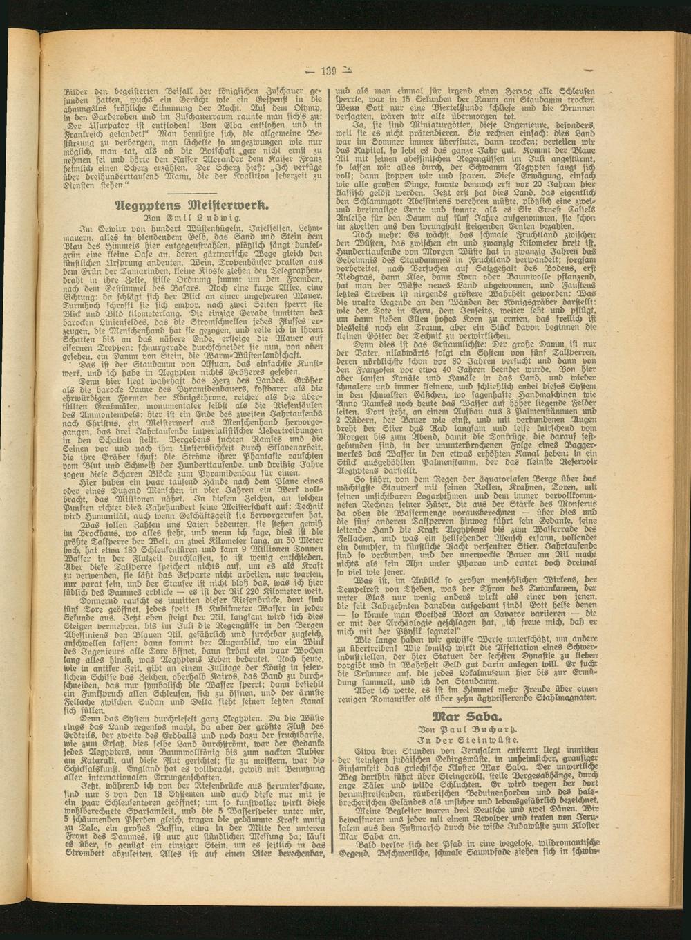 Ja, sie sind Miniaturgötter, diese Ingenieure, besonders, weil sie cs nicht prätendieren. Sie rechnen einfach: dies Land war im Sommer immer überflutet, dann trocken; verteilen wir das Kapital, so lebt es das ganze Jahr gut. Kommt der Blaue Nil mit seinen abessinischen Regengüssen im Juli angestürmt, so lassen wir alles durch, der Schwamm Aegypten saugt sich voll; dann stoppen wir und sparen. Diese Erwägung, einfach wie alle großen Dinge, konnte dennoch erst vor 20 Jahren hier klassisch gelöst werden. Jetzt erst hat dies Land, das eigenllich den Schlammgott Abessiniens verehren müßte, plötzlich eine zwei- und dreimalige Ernte und konnte, als es Sir Ernest Cassels Anleihe für den Damm auf fünf Jahre ausgenommen, sie schon im zweiten aus den sprunghaft steigenden Ernten bezahlen.
