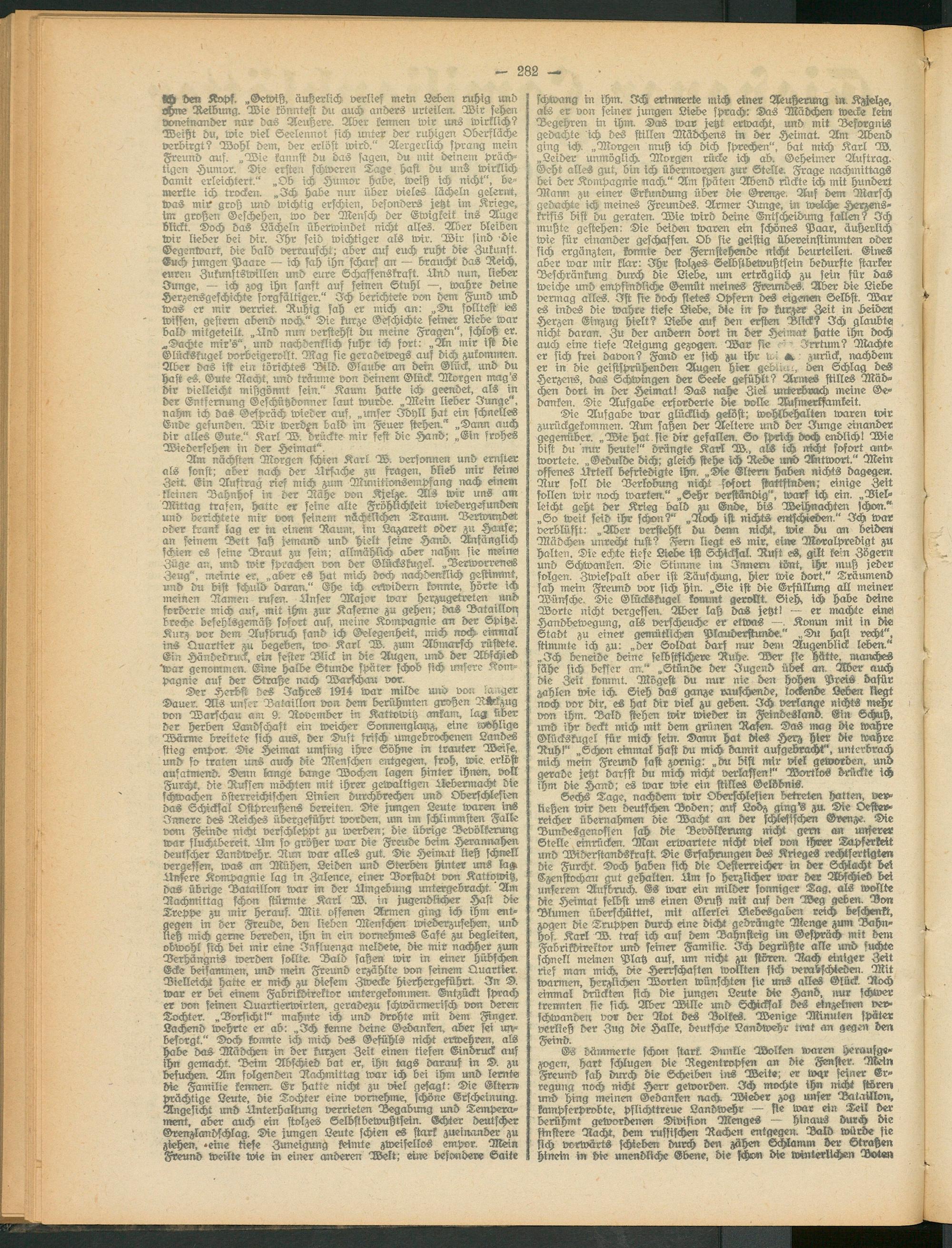 Der Herbst des Jahr^ 1914 war milde und von -aager Dauer. Als unser Bataillon von dem berühmten großen AKckzug von Warschau am 9. Rovember in Kattvwitz ankam, lag über der herben Landschaft ein weicher Sonnenglanz, eine awhligs Wärme breitete sich aus, der Duft frisch, umgebrochen,en Landes stieg empor. Die Heimat umfing ihre Söhne in trauter Weise, und so traten uns auch die Menschen entgegen, froh, wie erlöst aufatmend. Denn lange bange Wochen lagen hinter ihnen, voll Furcht, die Russen möchten mit ihrer gewaltigen älebermacht die schwachen österreichischen Linien durchbrechen und Oberschlesien das Schicksal Ostpreußens bereiten. Die jungen Leute waren ins Innere des Reiches übergeführt worden, um im schlimmsten Falle vom Feinde nicht verschleppt zu werben; die übrige Bevölkerung war fluchtbereit. Um so größer war die Freude beim Herannahen deutscher Landwehr. Run war alles gut. Die Heimat ließ schnell vergessen, was an Mühen, Leiden und Sterben hinter uns lagt Unsere Kompagnie lag in Zalence, einer Dorstadt von Kattvwitz, das übrige Bataillon war in der Umgebung untergebracht. Am Nachmittag schon stürmte Karl W. in jugendlicher Hast die Treppe zu mir herauf. Mit offenen Armen ging ich ihm entgegen in der Freude, den lieben Menschen wiederzusehen, und lieh mich gerne bereden, ihn in ein vornehmes Safe zu begleiten, obwohl sich bei mir eine Influenza meldete, die mir nachher zum Derhängnis werden sollte. Bald sahen wir in einer hübschen Ecke beisammen, und mein Freund erzählte von seinem Quartier. Bielleicht hatte er mich zu diesem Zwecke hierhergeführt. In D. war er bei einem Fabrikdirektor untergekommen. Entzückt sprach er von seinen Quarfierwirten, geradezu schwärmerisch von deren Tochter. „Dorsicht!" mahnte ich und drohte mit dem Finger. Lachend wehrte er ab: „Ich kenne deine Gedanken, aber sei unbesorgt." Doch formte ich mich des Gefühls nicht erwehren, als habe das Mädchen in der kurzen Zeit einen tiefen Eindruck auf ihn gemacht. Beim Abschied bat er, ihn tags darauf in D. zu besuchen. Am folgenden Rachmittag war ich bei ihm und lernte die Familie kennen. Er hatte nicht zu viel gesagt: Die Eltern echtige Leute, die Tochter eine vornehme, schöne Erscheinung.