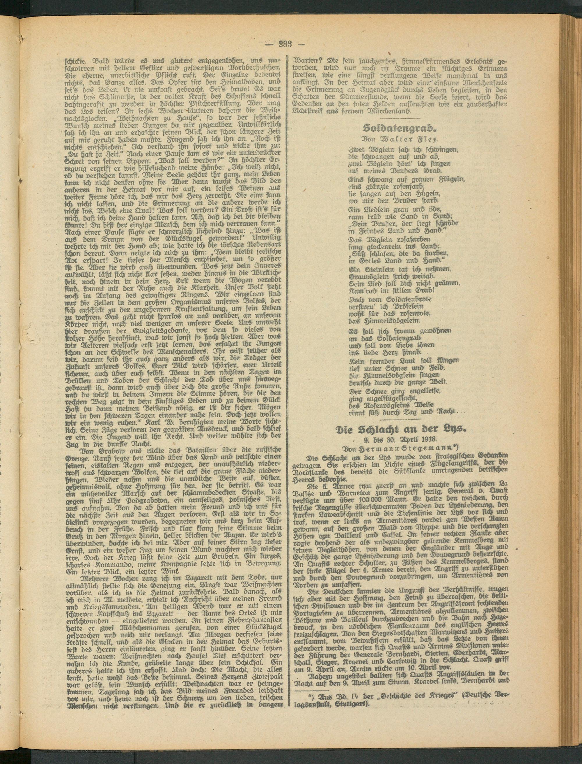 Warten? Die fein jauchzendes, himmelstürmeirdes Erlebnis geworden, wird nur noch! im Traume ein flüchtiges Erinnern streifen, wie eine längst verklungene Weise manchmal in uns anklingt. In der Heimat aber wird eine' einsam« MensGenfeele die Erinnerung an Jugendglück durchs Leben begleiten, in dem Schatten der Dämmerstunde, wenn die Seele feiert, wird das Gedenken an den toten Helden aufleuchtsn wie ein zauberhafter Lichtstreif aus fernem Märchenland.