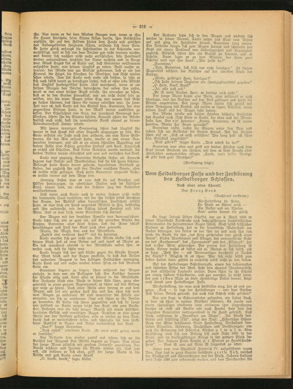 Auf der Heidelberger Schloßterrasse, einem der bekanntesten und schönsten Plätze der Welt, steht sein ehernes Wandererbild, zu dem alljährlich Tausende wallen. Dann führt sie ihr Schritt zur einzig schönen Schloßruine, und gar mancher, ja wohl jeder, der zum ersten Male an diese ehrwürdige Stätte kommt, steigt auch hinab zum Heidelberger Fasse.