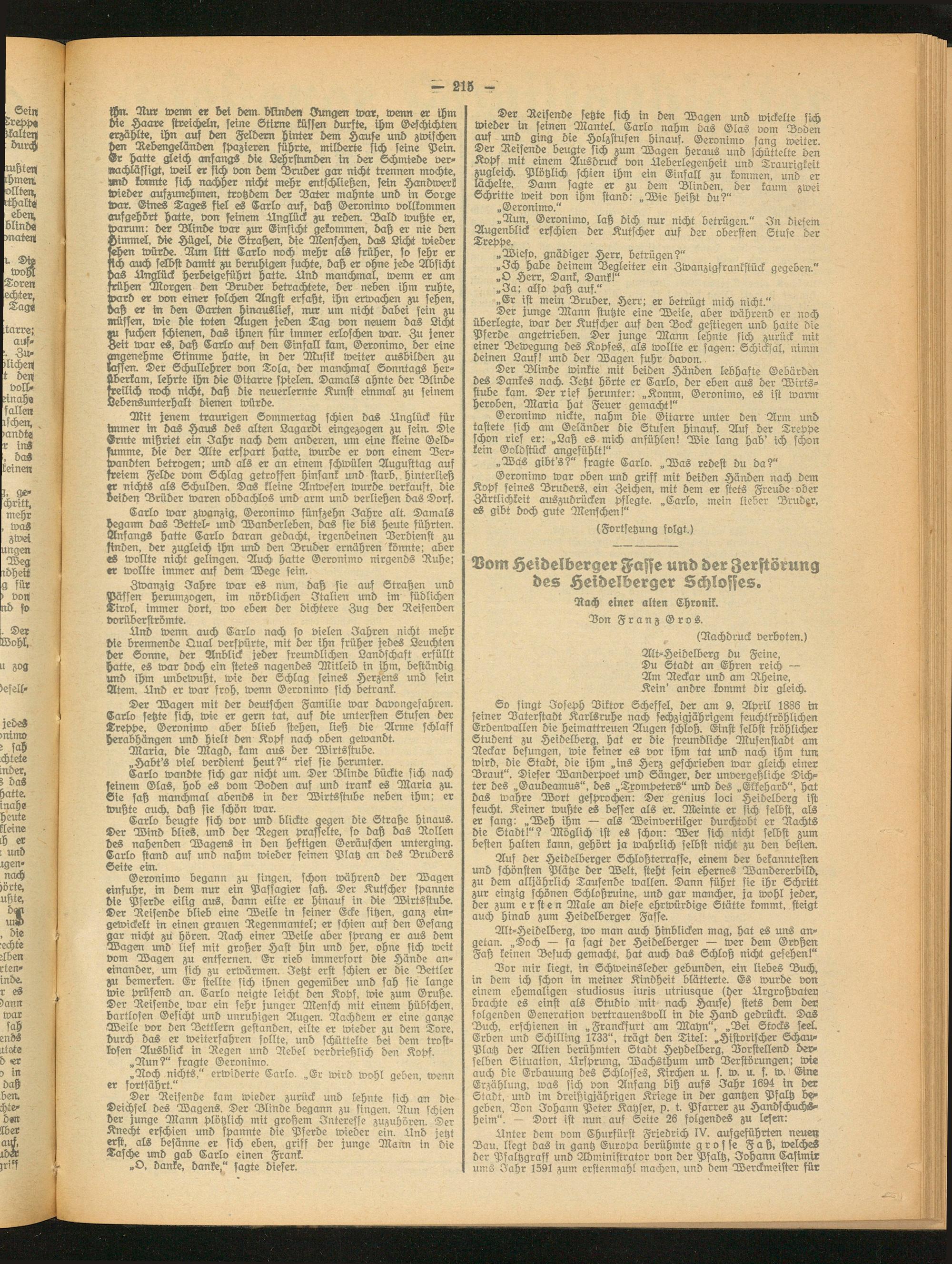 Der Blinde winkte mit beiden Händen lebhafte Gebärden des Dankes nach. Jetzt hörte er Carlo, der eben aus der Wirtsstube kam. Der rief herunter: „Komm, Geronimo, es ist warm heroben, Maria hat Feuer gemacht!"