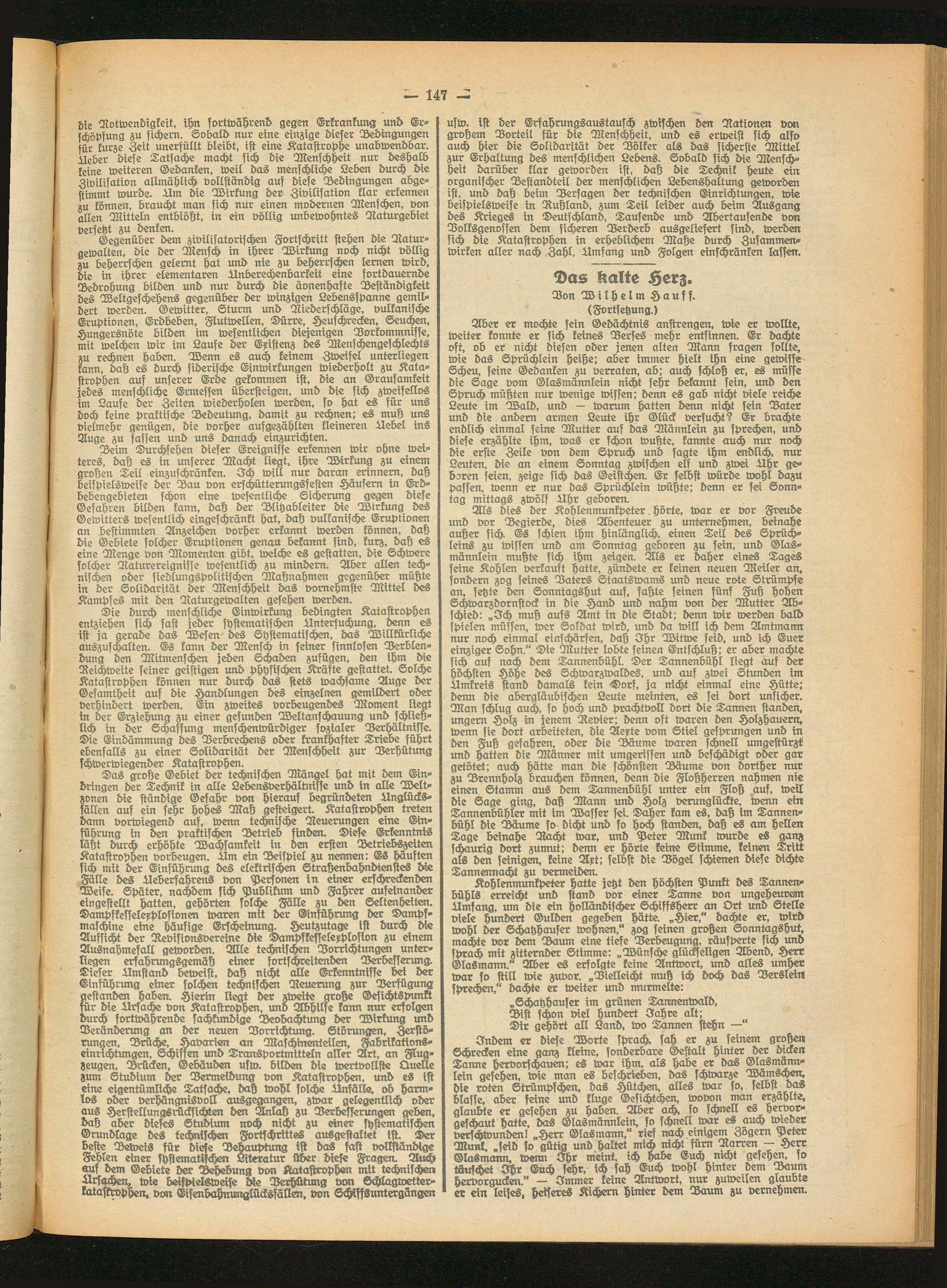 Kohlenmunkpeter hatte jetzt den höchsten Punkt des Tannen- bühls erreicht und stand vor einer Tanne von ungeheurem Llmfang, um die ein holländischer Schiffsherr an Ort und Stelle viele hundert Gulden gegeben hätte. „Hier," dachte er, wird wohl der Schatzhauser wohnen," zog seinen großen Sonntagshut, machte vor dem Daum eine tiefe Verbeugung, räusperte sich und sprach mit zitternder Stimme: „Wünsche glückseligen Abend, Herr Glasmann." Aber es erfolgte keine Antwort, und alles umher war so still wie zuvor. „Vielleicht muß ich doch das Derslein! sprechen," dachte er weiter und murmelte: