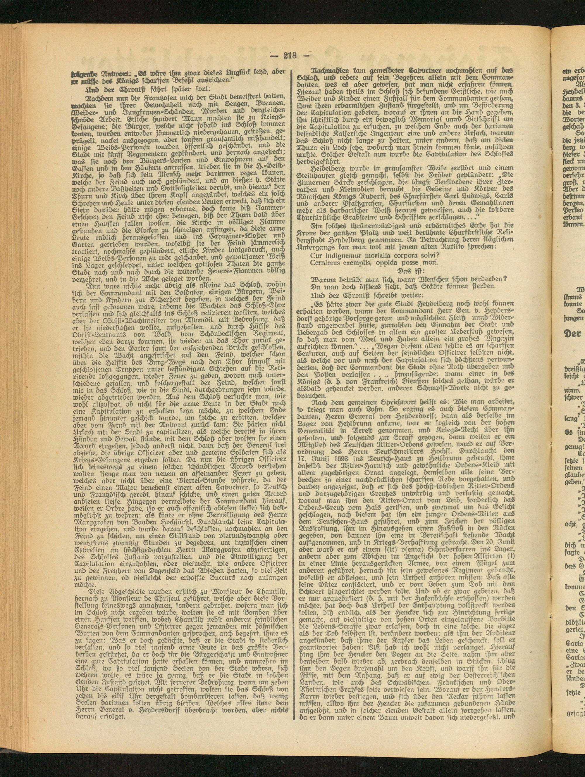 „Es hätte zwar die gute Stadt Hehdelberg noch wohl können erhalten werden, wann der Commandant Herr Gen. v. Heydersdorff gehörige Vorsorge getan und möglichsten Fleiß unnd Widerstand angewendet hätte, zumahlen beh Einnahm der Stadt und HeBerga6 des Schlosses in allem ein grosser Aeberfluß gewesen, fo daß man vom Weel und Haber allein ein großes Magazin aufrichten können."... „Wegen diesem allem fehlte es an schärften Censuren, auch auf Seiten der feindlichen Officirer selbsten nicht, als welche vor und nach der Capitulation sich höchstens verwunderten, daß der Commandant die Stadt ohne Äoth übergeben und den Posten verlassen. . ., hinzusügende: wann einer in des Königs (d. h. von Frankreich) Diensten solches gethan, würde er alsbald gehencket werden, anderer Schimpff-Worte nicht zu gebrauchen. . .