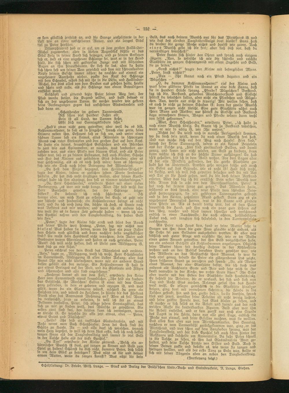 „Ja, Herr Schatzhauser," erwiderte Peter mit einer tiefen Verbeugung, „es war mir recht bange. Aber Ihr seid wohl der Herr Auerhahn gewesen, der die Schlange totgebissen? Da bedanke ich mich schönstens. — Ich lomijte aber, um mich Rats zu erholen bei Euch; es geht mir gar schlecht und hinderlich; ein Kohlenbrenner bringt es nicht weit, und da ich noch jung bin, dächte ich doch, es könnte noch was Besseres aus mir werden; und' wenn ich oft andere sehe, wie weit die es in kurzer Zeit gebracht haben — wenn ich nur den Ezechiel nehme und den Tanzbodenkönig, die haben Geld wie Heu."