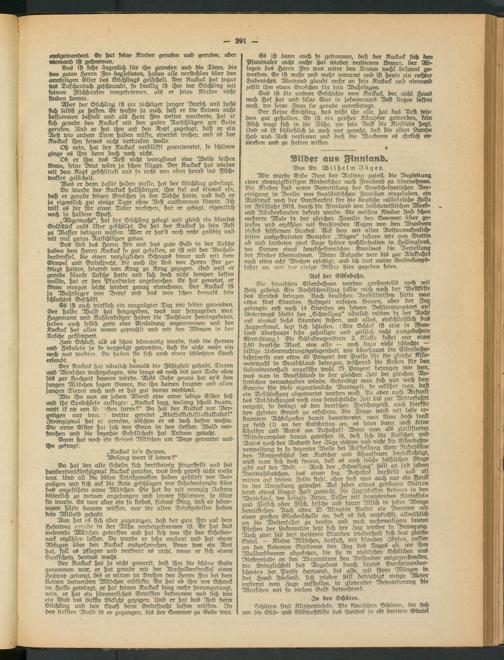 Mir wurde Ende Juni der Auftrag zuteil, die Begleitung einer zwanzigköpfigm Kinderschar nach Finnland zu übernehmen. Die Kinder sind unter Vermittlung der Deutsch-finnischen Vereinigung in Berlin von finnländischen Familim eingeladen, ein Ausdruck noch der Dankbarkeit für die deutsche militärische Hilfe im Frühjahr 1918, durch die Finnland von bolschewistischen Mord- und Räuberbandm befreit wurde. Die meisten Kinder sind schon mehrere Male in der gleichen Familie den Sommer über gewesen und erzählen mit strahlenden Augen von dm Wundem dieses seltsamen Landes. Auf dem mit alten Reiseannehmlich- feiten ausgestatteten Dampfer „Rügen" füllten wir von Stettin ab und landeten zwei Tage fpäter wohlbehalten in Helsingfovs, wo Damen eines dmtsch-finnischm Komitees die Verteilung der Kinder übernahmm. Meine Aufgabe war bis zur Rückfahrt nach etwa acht Wochen erledigt, und ich trat meine Entdeckungsfahrt an, von der einige Bilder hier gegeben seien.