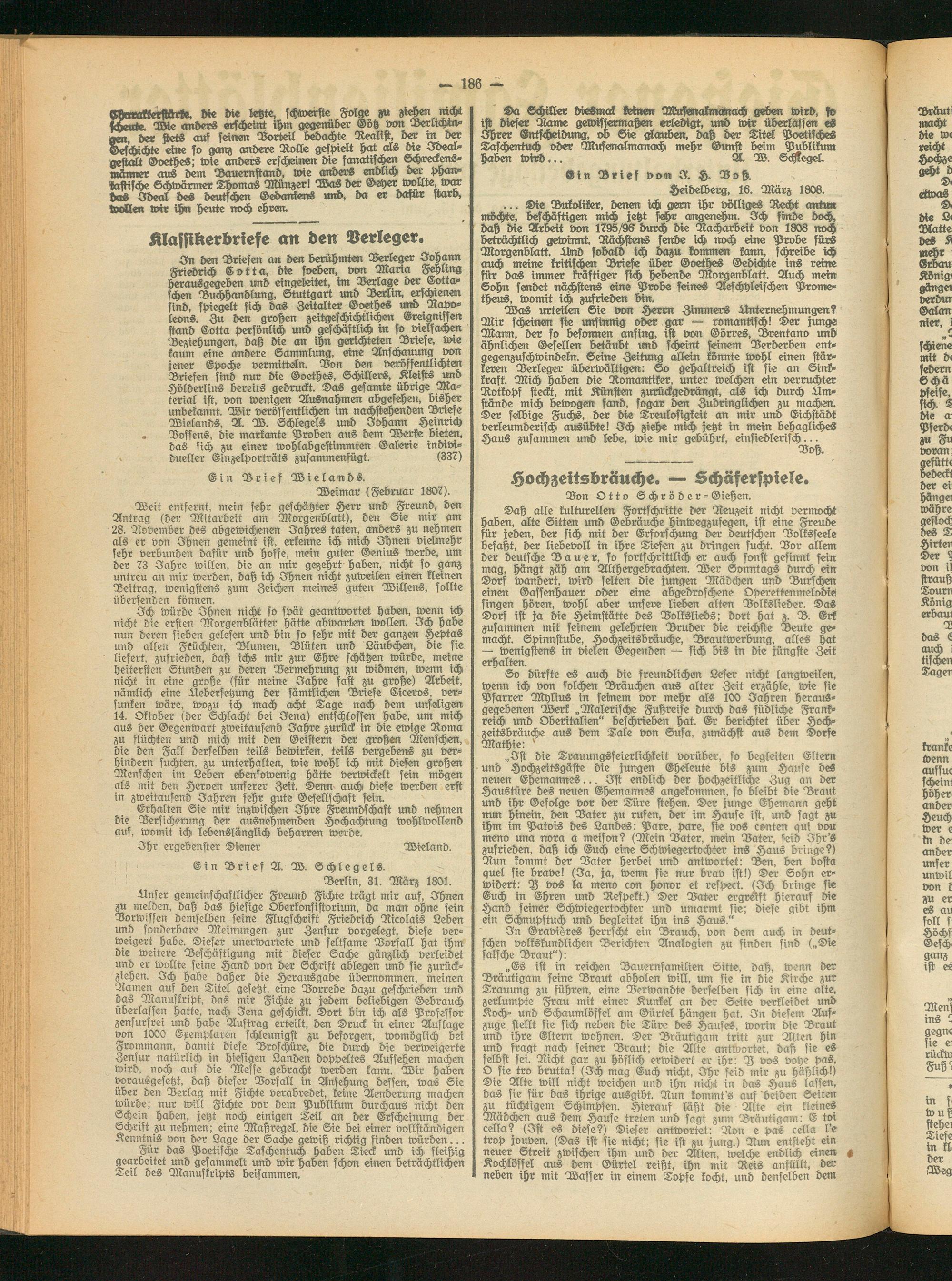 In den Briefen an den berühmten Verleger Johann Friedrich Cotta, die soeben, von Maria Fehling herausgegeben und eingeleitet, im Verlage der Cotta- schen Buchhandlung, Stuttgart und Berlin, erschienen sind, spiegelt sich das Zeitalter Goethes Rapv- leons. Zu den großen zeitgeschichtlichen Ereignissen stand Cotta persönlich und geschäftliche in so vielfachen Beziehungen, daß die an ihn gerichteten Briefe, wie kaum eine andere Sammlung, eine Anschauung von jener Epoche vermitteln. Von den veröffentlichten Briefen sind nur die Goethes, Schillers, Kleists und Hölderlins bereits gedruckt. Das gesamte übrige Material ist, von wenigen Ausnahmen abgesehen, bisher unbekannt. Wir veröffentlichen im nachstehenden Briefe Wielands, A. W. Schlegels und Johann Heinrich Vossens, die markante Proben aus dem Werke bieten, das sich zu einer wohlabgestimmten Galerie individueller Einzelporträts zusammenfügt. (337)