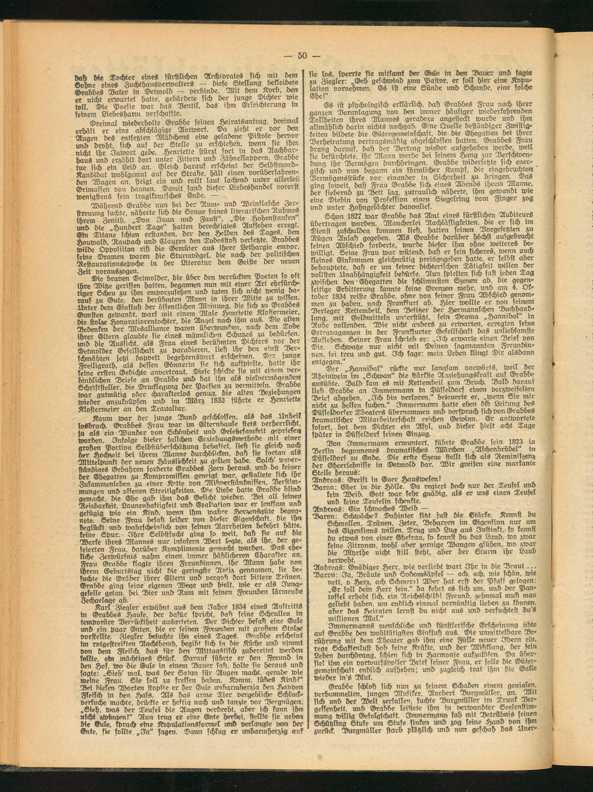 Dreimal wiederholte Grabbe seinen Heiratsantrag, dreimal erhält er eine abschlägige Antwort. Da zieht er vor den Augen des entsetzten Mädchens eine geladene Pistole hervor und droht, sich auf der Stelle zu erschießen, wenn sie ihm nicht ihr Jawort gebe. Henriette stürzt fort in das Vachbarhaus und erzählt dort unter Zittern und Zähneklappern, Grabbe tue sich ein Leid an. Gleich darauf erscheint der Selbstmord-- Kandidat wohlgemut auf der Straße, hält einen voruberfahren- den Wagen an, steigt ein und rollt laut lachend unter allerlei., Grimassen von danneir. Damit fand dieser Liebeshandel vorerst wenigstens sein tragikomisches Ende. —
