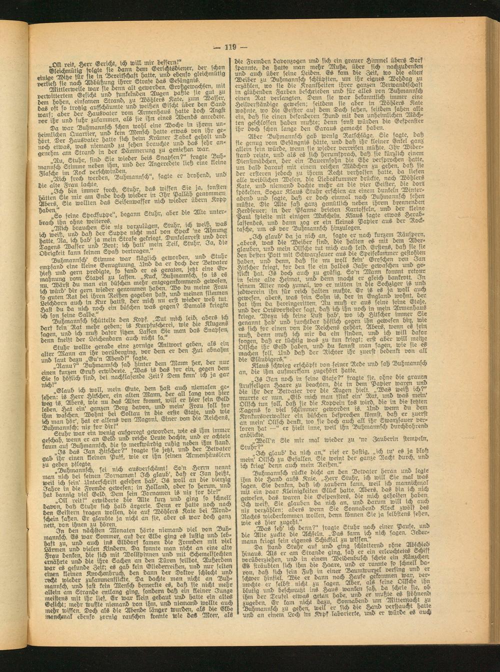 „Ich glaub' da ja nich an, sagte er nach kurzem Räuspern, «Hers was die Weiber sind, die halten es mit dem Aber- glauben, und mein Ollsche tut mich auch leid. Erstens, dah sre sie den besten Pott mit Schwarzsauer aus die Speisekammer gestohlen haben und denn, dah sie nu wykl fein' Groschen von Jan Hitscher kriegt, for den sie ein halbes Jahr gewaschen und geflickt hat. Is doch auch zu gräsig. So'n Mann kommt retour in seine alte Heimat, und denn macht er gleich bankrott, un seinem Alter noch zumal, wo er mitten in die Sechziger is und iedwerein ihn für reich halten mutzte. Er is es ja woll auch gewesen, abers, was sein Sohn is, der in England wohnt, der hat ihm da hereingeritten. Nu muh er aus seine ferne Etaje, und der Ortsvor-steher- sagt, dah ich ihn noch in mein Armenhaus kriege Wozu ich keine Lust hab', wo ich Hitscher immer Sie genannt hab' und furchtbar höflich gegen ihn gewesen big, wie I es sich fvr einen von die Reichens gehört. Abers, wenn es fem mutz, denn mutz ich mir da ein finden, und ich Witt dafor sorgen Latz er tüchtig was zu tun kriegt; erst aber will mente i Ollsche ihr Geld haben, und du kannst man sagen, wie sie es machen soll. And dah der Richter ihr zuerst bedenkt von all