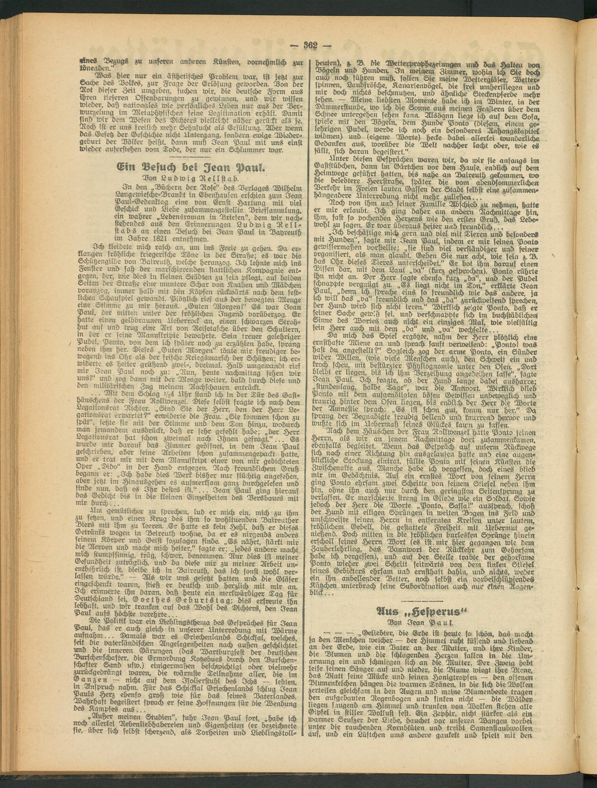 In den „Büchern der Rose" des Berlages Wilhelm Langewiesche-Dranbt in Ebenhausen erschien zum Jean Paul-Gedenktag eine von Ernst Hartung mit viel Geschick und Liebe zusammengestellte Drtefsammlung, ein wahrer „Lebensroman in Briefen", dem wir nachstehendes aus den Erinnerungen Ludwig Rell - stabs an einen Besuch bei Jean Paul in Bayreuth im Jahre 1821 entnehmen.