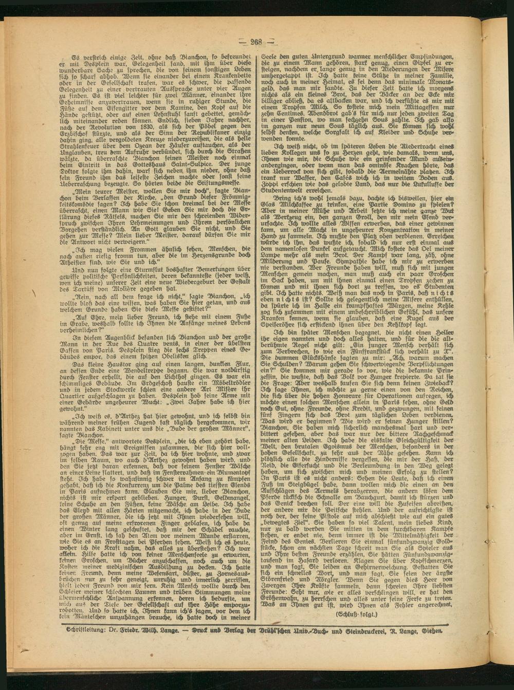 Es verstrich einige Zeit, ohne baß Bianchon, so befreundet er mit Desplein mar, Gelegenheit fand, mit ihm über diese munderbare Sache zu sprechen, die von seinem sonstigen Leben sich so scharf abhob. Wenn sie einander bei einem Krankenbette oder in der Gesellschaft trafen, Ivar es schwer, die passende Gelegenheit zu einer vertrauten Aussprache unter vier Augen zu finden. Es ist viel leichter für zwei Männer, einander ihre Geheimnisse anzuvertrauen, wenn sie in ruhiger Stunde, die Füße auf dem Eifengitter vor dem Kamine, den Kopf auf die Hände gestützt, oder auf einen Lehnstuhl sanft gebettet, gemächlich miteinander reden können. Endlich, sieben Jahre nachher, nach der Revolution von 1830, als sich der Pöbel gegen den Erzbischof stürzte, und als der Sinn der Republikaner einzig dahin ging, alle vergoldeten Kreuze niederzureißen, die als helle Strahlenfeuer über dem Ozean der Häuser auftauchen, als der Anglauben, treu dem Aufruhr verbündet, sich durch die Straßen wälzte, da überraschte Bianchon seinen Meister noch einmal beim Eintritt in das Gotteshaus Saint-Sulpice. Der junge Doktor folgte ihm dahin, warf sich neben ihm nieder, ohne daß fein Freund ihm das leiseste Zeichen machte oder sonst seine Aeberraschung bezeugte. So hörten beide die Stiftungsmesse,