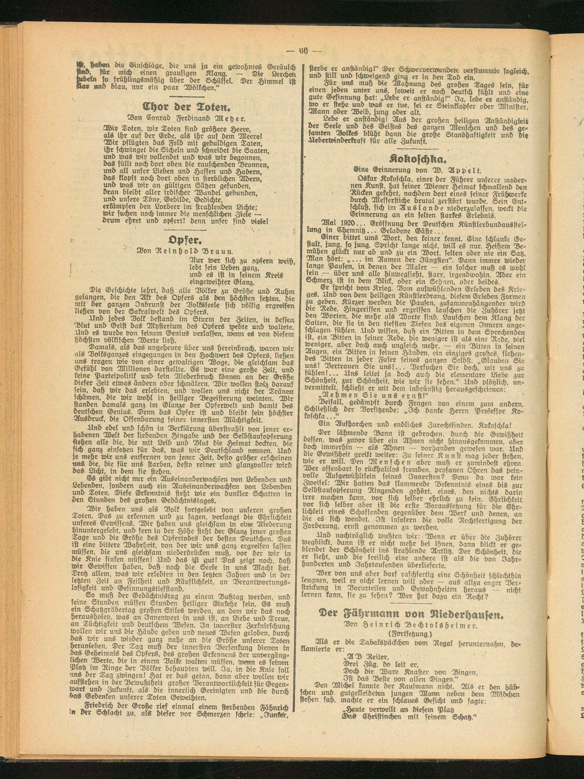 Und edel und schön in Verklärung überstrahlt von jener erhabenen Welt der liebenden Hingabe und der Selbstaufopferung stehen alle die, die mit Leib und Blut die Heimat deckten, die sich ganz einsetzen für das, was wir Deutschland nennen. Und je mehr wir uns entfernen von jener Zeit, desto größer erscheinen uns die, die für uns starben, desto reiner und glanzvoller wird das Licht, in dem sie stehen.