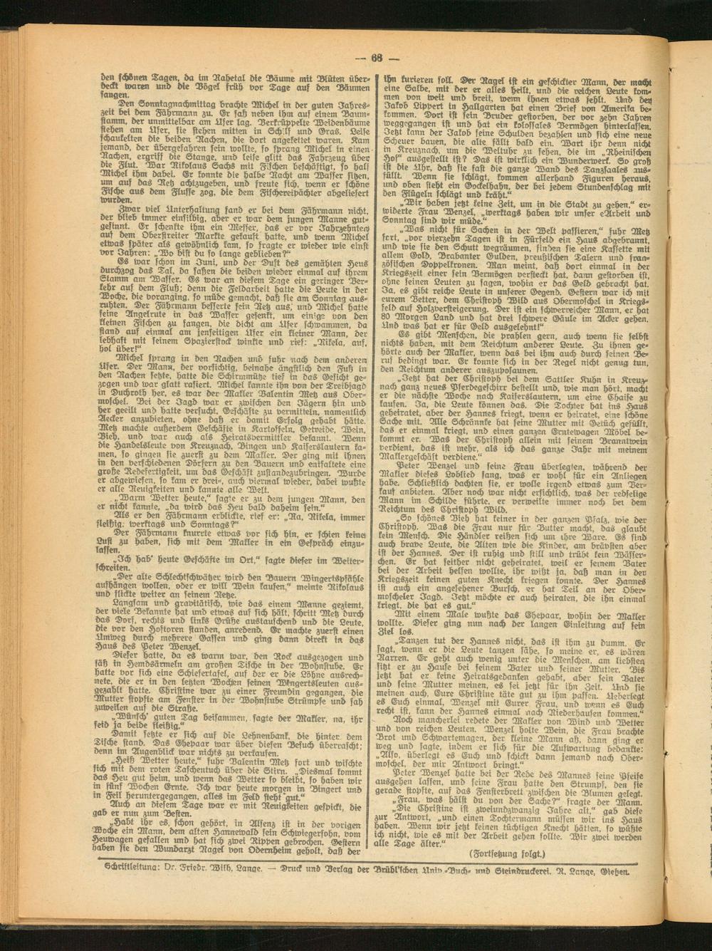 Den Sonntag-nachmittag brachte Michel in der guten Jahreszeit bei dem Fährmann zu. Er sah neben ihm auf einem Baumstamm, der unmittelbar am Ufer lag. Verki-üppelte Weidenbäume stehen am Ufer, sie stehen mitten in Schilf und Gras. Leise schaukelten die beiden Bachen, die dort angekettet waren. Kam jemand, der übergefahren sein wollte, so sprang Michel in einen Bachen, ergriff die Stange, und leise glitt das Fahrzeug über die Flut. War Bikolaus Sachs mit Fischen beschäftigt, so half Michel ihm dabei. Er konnte die halbe Bacht am Wasser sitzen, um auf das Betz achtzugeben, und freute sich, wenn er schöne Fische aus dem Flusse zog, die dem Fischereipächter abgeliefert wurden.