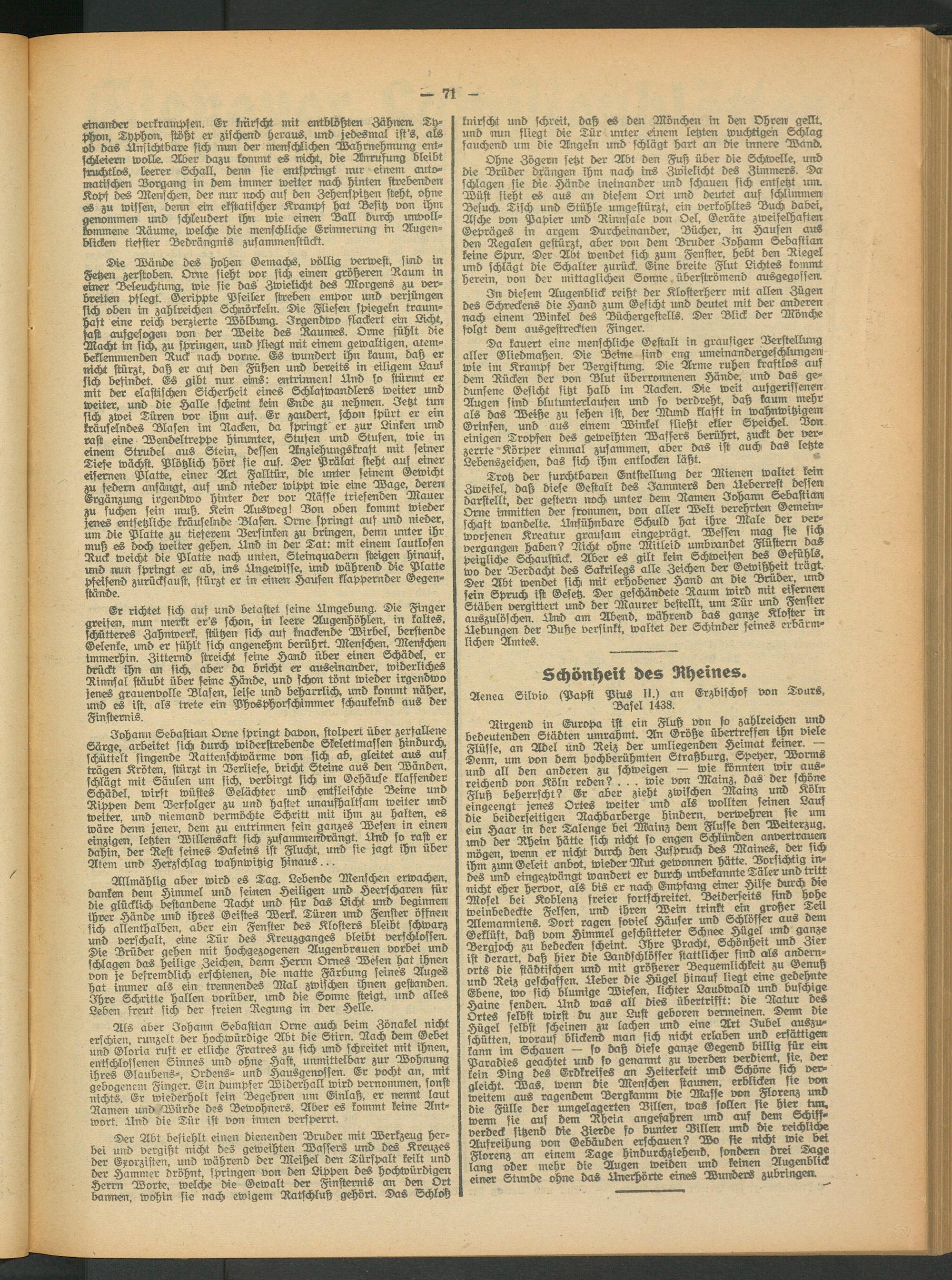 Allmählig aber wird es Tag. Lebende Menschen erwachen, danken dem Himmel und seinen Heiligen und Heerscharen für die glücklich bestandene Rächt und für das Licht und beginnen ihrer Hände und ihres Geistes Werk. Türen und Fenster öffnen sich allenthalben, aber ein Fenster des Klosters bleibt schwarz und verschalt, eine Tür des Kreuzganges bleibt verschlossen. Die Brüder gehen mit hochgezogenen Augenbrauen vorbei und schlagen das heilige Zeichen, denn Herrn Ornes Wesen hat ihnen von je befremdlich erschienen, die matte Färbung seines Auges hat immer als ein trennendes Mal zwischen ihnen gestanden. Ihre Schritte hallen vorüber, und die Sonne steigt, und alles Leben freut sich der freien Regung in der Helle.