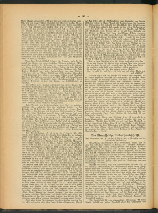 Manessesche Handschrift? Eine Erinnerung taucht auf an eine der lieblichsten Blüten tm Kranze der „Züricher Novelleri'. Sm Rahmen der zarten Lieb^geschichte des jungen Hadlaub erzählt Meister Keller von den Züricher Patriziern Rüden er Manesse und seinem Sohne, dem Küster Sohannes, die zu Anfang des 14. Sahrhunderts wrrch besagtes Singer- und Schreiberlein über ganz Deutschland hin aus Städten, Burgen und Klöstern Liederbücher einbringen ließen. Eine umfangreiche Pergament- Handschrift ward danach gefertigt, die, zierlich geschrieben und mit prachtvollen Bildern geziert, eine herrliche Sammlung deutschen Minnesangs darstellte.