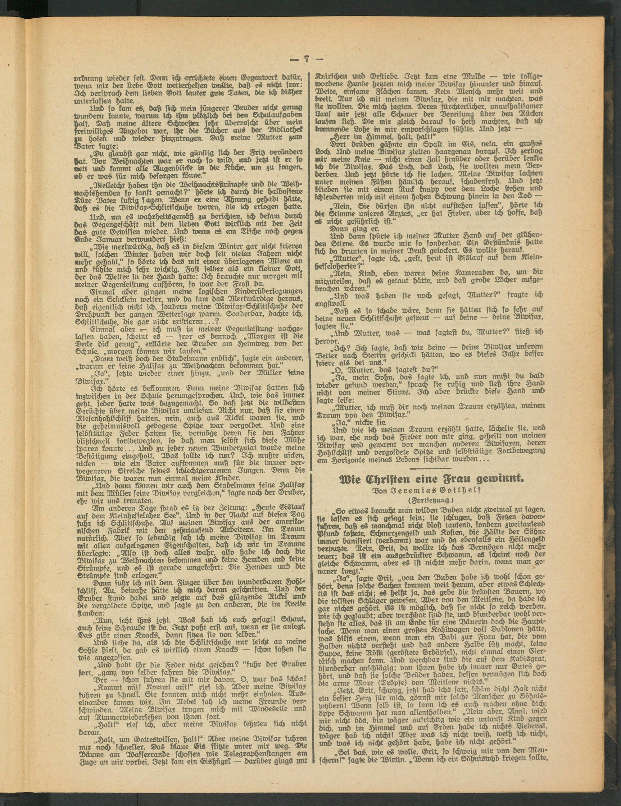 „3a", sagte Grit, „von den Buben habe ich wohl schon gehört. denn solche Sachen kommen weit herum, aber etwas Schlech- tis ist das nicht; es heißt ja, das gebe die bravsten Bauern, wo die tollsten Schläger gewesen. Aber von den Meiilene, da habe ich gar nichts gehört. Es ist möglich, dah sie nicht so reich werden, wie ich geglaubt; aber werchbar sind sie, und bsunderöar wohl verstehn sie alles, das ist am Ende für eine Bäuerin doch die Hauptsache. Wenn man einen großen Kohlwagen voll Dublonen hätte, was Hilfs einem, wenn man ein Dabi zur Frau hat, die vom Halben nichts versteht und das andere Halbe lätz macht, keine Suppe, keine Rösti (geröstete Erdäpfel), nicht einmal einen Sier- tätsch machen kann. And werchbar sind die auf dem Kabisgrat, bfunberbar anschlägig; von ihnen habe ich immer nur Gutes g^ hört, und dah sie solche Brüder haben, dessen vermögen sich doch die arme More (Tröpfe) von Meitlene nichts."