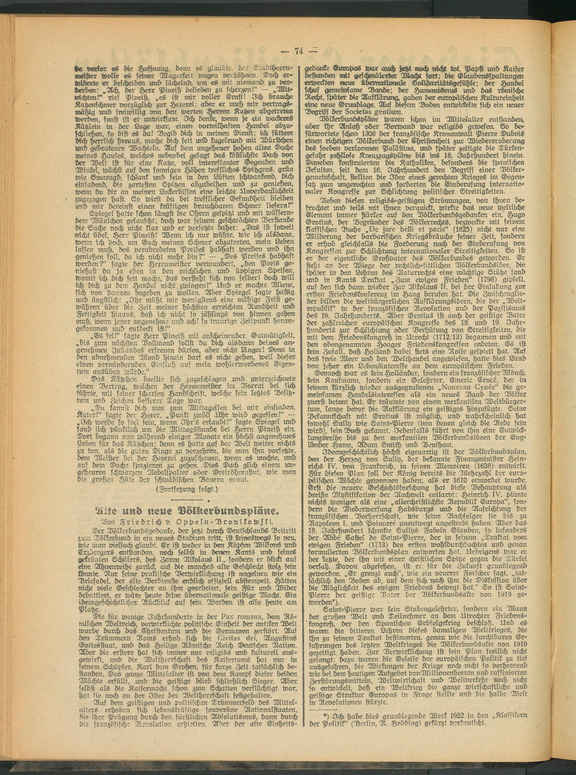 Jdeengeschichtlich höchst eigenartig ist der Völkerbundsplan, den der Herzog von Sully, der bekannte Fincmzmimster Heinrichs IV. von Frankreich, in seinen Memoiren (1638) entwirft. Für diesen Plan soll der König bereits die Mehrzahl der europäischen Mächte gewönne:: haben, als er 1610 ermordet wurde. Erst die neuere Geschichtsforschung hat diese Behauptung als dreiste Mhstiftkation der Nachwelt entlarvt: Heinrich IV. plante nichts weniger als eine „allerchristlichste Republik Europa", sondern die Niederwerfung Habsburgs und die Aufrichtung der französischsn Vorherrschaft, wie seine lliachsvlger sie bis zu Napoleon I. und Poincare unentwegt angestrebt haben Aber das 18. Jahrhundert schenkte Sullys Fabeln Glauben, so besonders der Abbe Casiel de Saint-Pierre, der in seinem „Traktat vom ewige:: Frieden" (1713) den ersten wohldurchdachten und genau formulierten Völkerbundsplan entworfen hat. älebrigens war er der letzte, der ihn mit einer christlichen Spitze gegen die Türkei versah. Davon abgesehen, ist er für die Zukunft grundlegend geworden. „Er grenzt auch", wie ein neuerer Forscher sagt, „tatsächlich den Boden ab, auf dem sich nach ihn: die Diskussion über die Möglichkeit des ewigen Friedens bewegt hat." So ist Saint- Pierre der geistige Vater der Völkerbundsakte von 1919 geworden*).