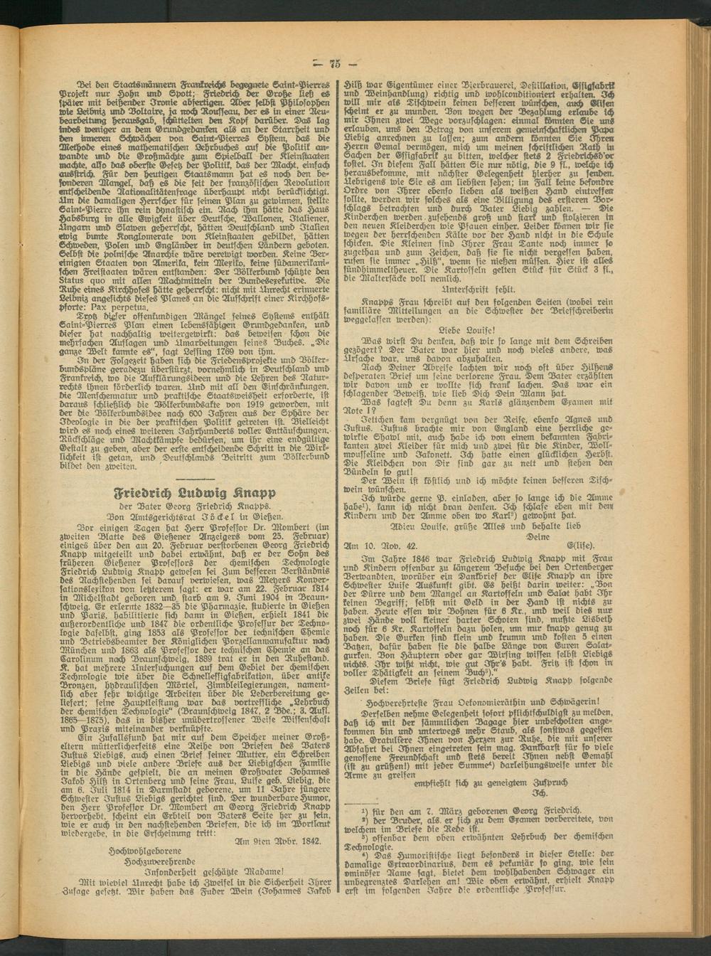 Dor einigen Tagen hat Herr Professor Dr. Mombert (im zweiten Blatte des Gießener Anzeigers vom 25. Februar) einiges über den am 20. Februar verstorbenen Georg Friedrich Knapp mitgefeilt und dabei erwähnt, daß er der Sohn des früheren Gießener Professors der chemischen Technologie Friedrich Ludwig Knapp gewesen sei Zum besseren Verständnis des Nachstehenden sei darauf verwiesen, was Meyers Konversationslexikon von letzterem sagt: er war am 22. Februar 1814 in Michelstadt geboren und. starb am 9. Juni 1904 in Braunschweig. Er erlernte 1832—35 die Pharmazie, studierte in Gießen und Paris, habilitierte sich dann in Gießen, erhielt 1841 die außerordentliche und 1847 die ordentliche Professur der Technologie daselbst, ging 1853 als Professor der technischen Chemie und Betriebsbeamter der Königlicher Porzellanmanufaktur nach München und 1863 als Professor der technischen Chemie an das Carolinum nach Braunschweig, 1889 trat er in den Ruhestand. K. hat mehrere Untersuchungen auf dem Gebiet der chemischen Technologie wie über die Schnellessigfabrikation, über antike Bronzen, hydraulischen Mörtel, Zinnbleilegierungen, namentlich aber sehr wichtige Arbeiten über die Lederbereitung geliefert; feine Hauptleistung war das vortreffliche .Lehrbuch der chemischen Technologie" (Braunschweig 1847, 2 Böe.; 3. Aufl. 1865—1875), das in bisher unübertroffener Weise Wissenschaft unö Praxis miteinander verknüpfte.