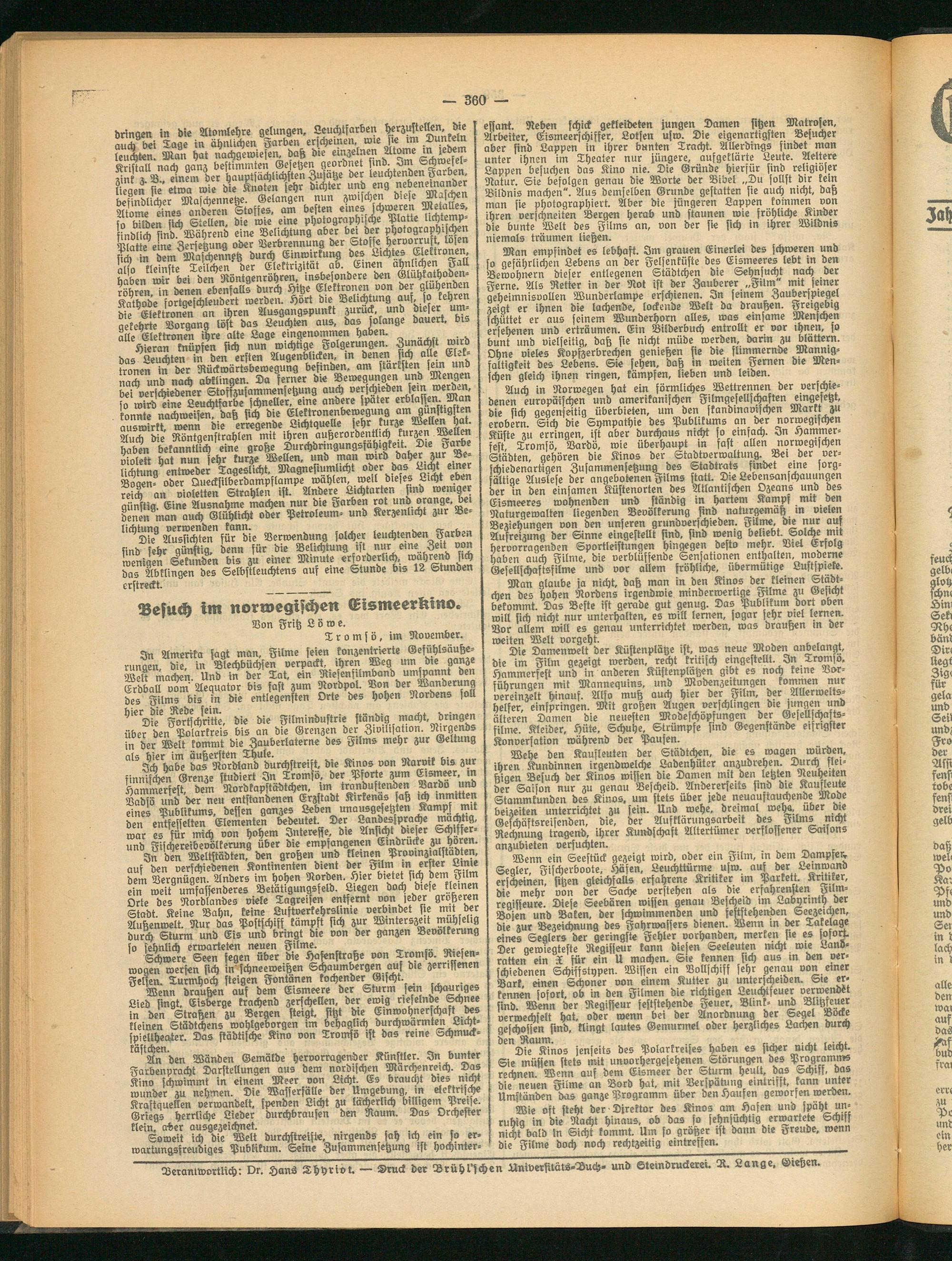 Die^ Forischrsite, die die Filmindustrie ständig macht, dringen über den Polarkreis bis an die Grenzen der Zivilisation. Nirgends in der Welt kommt die Zauberlaterne des Films mehr zur Geltung n15 habe das Nordlmcki durchstreift, die Kinos von Narvik bis zur finnischen Grenze studiert In Tromsö, der Pforte zum Eismeer m Hammerfest, dem Nordkapstädtchen, im tranduftenden Bardo und Vadsö und der neu entstandenen Erzstadt Kirkenas sah ich inmitten eines Publikums, dessen ganzes Leben unausgesetzten Kampf mit den entfesselten Elementen bedeutet. Der Landessprache mächtig, war es für mich von hohem Interesse, die Ansicht dieser Schifser- und Fischereibevölkerung über die empfangenen Eindrücke zu Horen.