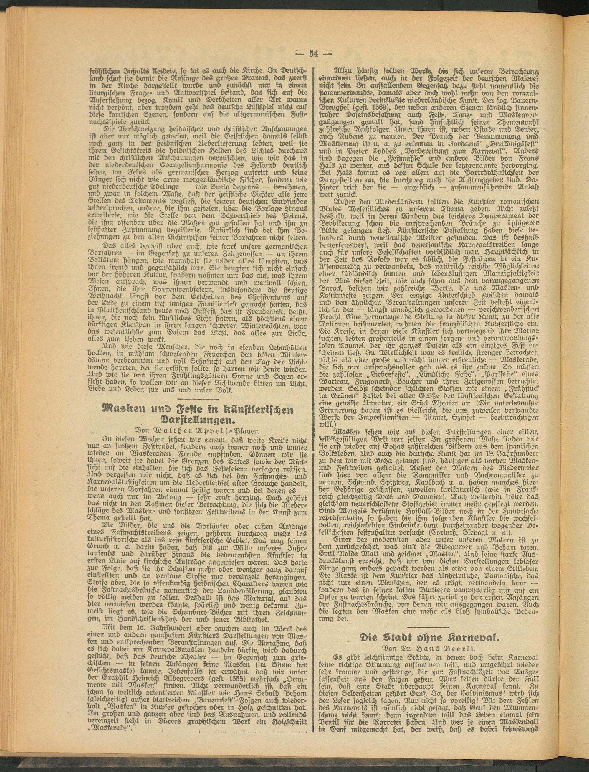 In diesen Wochen sehen wir erneut, daß weite Kreise nicht nur an frohem Festtrubel, sondern auch immer noch und immer wieder, an, Maskeraden Freude empfinden. Gönnen wir sie ihnen, soweit sie dabei die Grenzen des Taktes sowie der Rück- ficht auf die einhalten, die sich das Festefeiern versagen müssen, -ttnd vergessen wir nicht, daß es sich bei den Fastnachts- und Karnevalslustigkeiten um die ileberbteibfel alter Bräuche handelt, die unseren Vorfahren einmal heilig waren und bei denen es — toemt auch nur im Anfang ■— sehr ernst herging. Doch gehört das nicht in den Rahmen dieser Betrachtung, die sich die Rieder- schlage des Masken- und sonstigen Festtreibens in der Kunst zum Thema gestellt hat.,